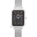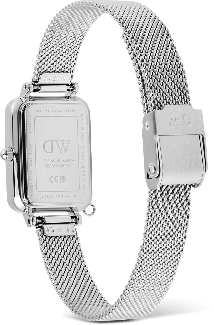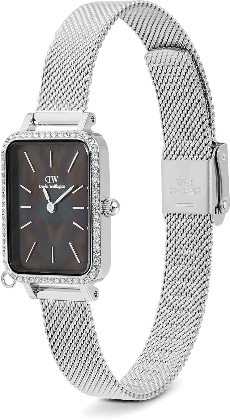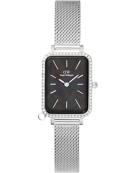 Женские наручные часы с минеральным стекломМинеральное стеклоМинеральное стекло представляет собой искусственно выращенный минерал кварца. Такое стекло отличается особой устойчивостью к повреждениям и царапинам. Уступает по некоторым качествам сапфировому стеклу. Daniel Wellington Quadro Crystal Zodiac Sterling DW00100747, кварцевый механизм с высокой точностью. Корпус часов изготовлен из нержавеющей стали. БезельБезельВнешний ободок, закрепляющий стекло. В спортивных часах так называется поворотное кольцо с делениями на циферблате, выполняет роль таймера – замеряет отрезки времени на шкале. Неподвижный безель – элемент декора. Однонаправленно вращающийся безель на дайверских часах позволяет фиксировать моменты погружения и выныривания на поверхность. украшен кристаллами Swarovski. Матовый циферблат украшен фирменным логотипом Daniel Wellington. Накладные метки в виде штрихов. Японский кварцевый механизм. Рифленая заводная головка. Класс водозащиты: 30 метров, позволит защитить корпус от случайных брызг или капель дождя. Стальной браслет миланского плетения на раскладном замкеРаскладной замокДанный вариант застежки используется только на часах с металлическим браслетом. Отличительная особенность такого крепления в том, что длина браслета становится универсальной и вы можете самостоятельно отрегулировать нужный вам размер – застежка просто двигается по браслету часов.. Корпус дополнен колечком для подвески.