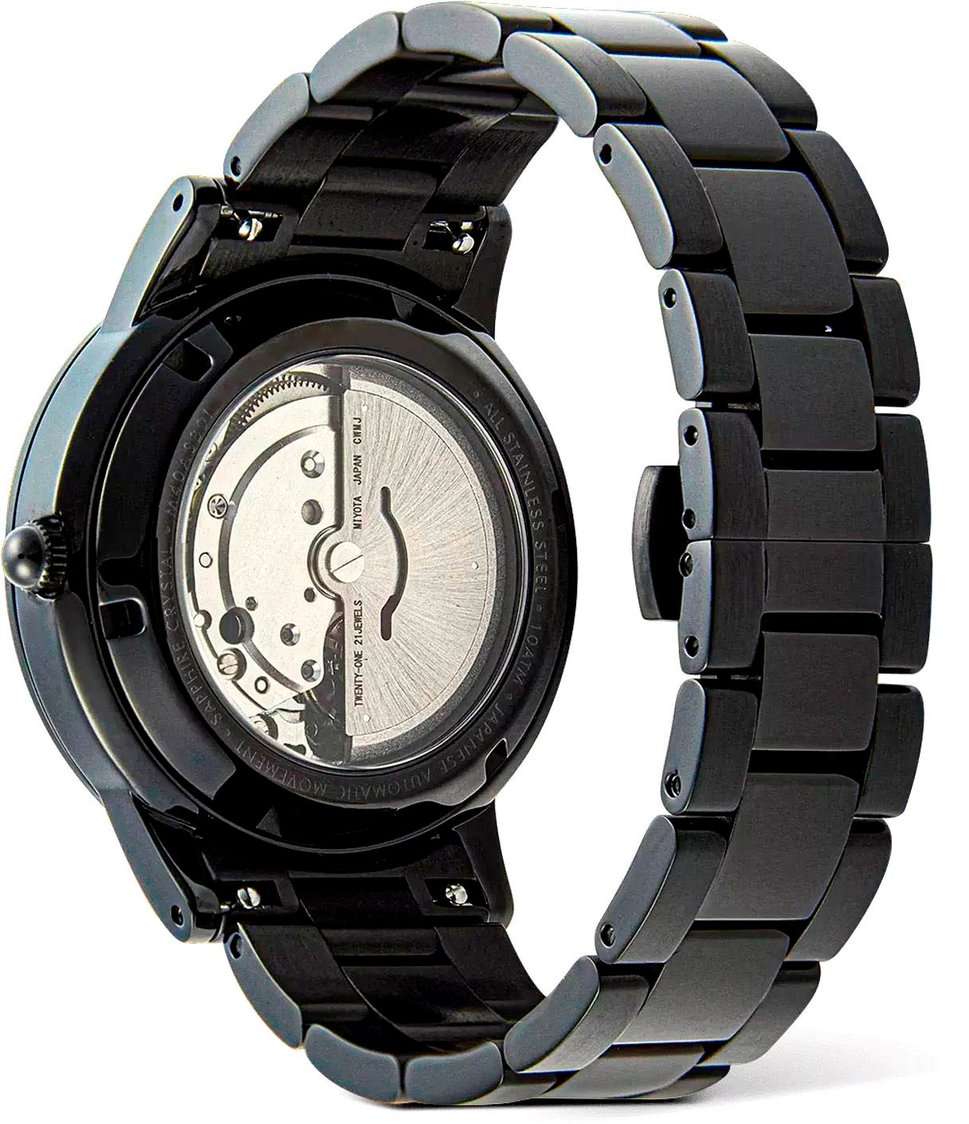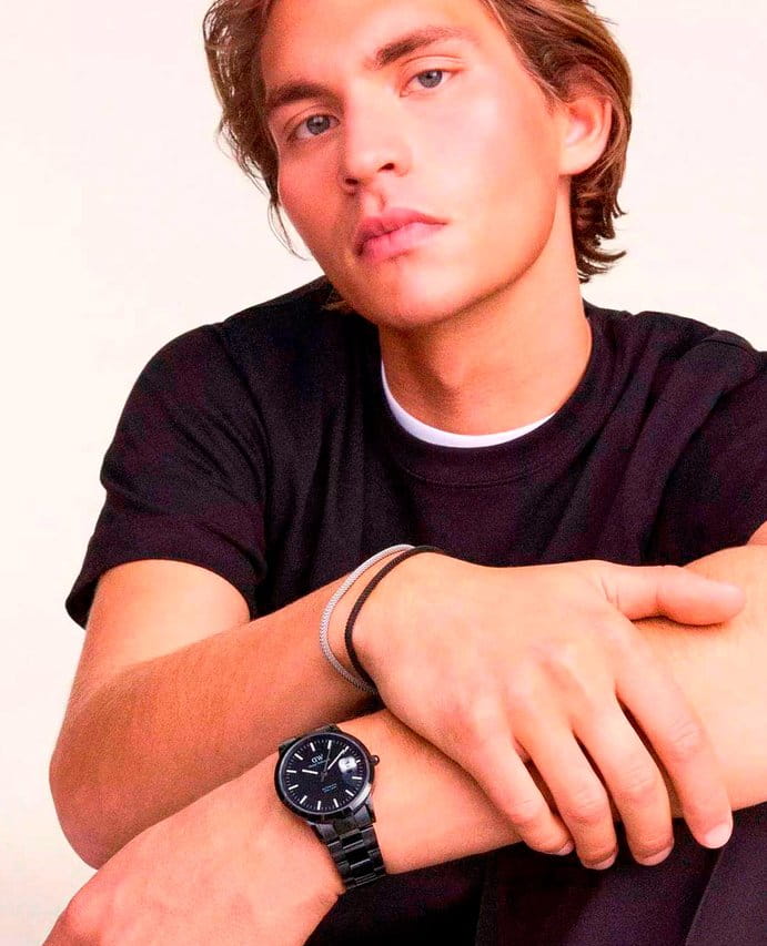 Мужские наручные часы Daniel Wellington DW00100753 из коллекции Iconic Automatic сочетают в себе элегантный дизайн и современные технологии . Модель обладает круглым корпусом диаметром 40 мм, выполненным из высококачественной нержавеющей стали с PVD-покрытиемPVDУльтратонкое покрытие наносится в технике вакуумного напыления, сочетает в себе нитрид титана особой прочности со слоем золота или оксида хрома. Несёт в себе декоративную или защитную функцию. черного цвета, что обеспечивает надежность и устойчивость к внешним воздействиям . Толщина корпуса составляет 9,5 мм, а циферблат защищен сапфировым стекломСапфировое стеклоПрочный и надёжный материал из кристалла сапфира синтетического происхождения, характеризующийся особой твёрдостью и устойчивостью к царапинам и повреждениям., устойчивым к царапинам и механическим повреждениям . Циферблат черного цвета украшен геометрическим узором и оснащен окном даты для удобства использования . Часы работают на японском автоматическом механизме, который поддерживается движением запястья, обеспечивая точность хода без необходимости использования батарейки . Браслет выполнен из нержавеющей стали с PVD-покрытиемPVDУльтратонкое покрытие наносится в технике вакуумного напыления, сочетает в себе нитрид титана особой прочности со слоем золота или оксида хрома. Несёт в себе декоративную или защитную функцию. черного цвета, что добавляет модели элегантности и делает ее подходящей как для повседневного использования, так и для официальных мероприятий . Застежка браслета выполнена в виде застёжки «бабочка» с кнопкамиЗастёжка "бабочка"Такой вид застёжки дополняется предохранителями, помогающими избежать случайного раскрытия браслета. Обладают изящным исполнением. , гарантирующей комфортное ношение и безопасность . Корпус часов оснащен прозрачной задней крышкой, позволяющей наблюдать за работой механизма, а также винтовой коронкой, обеспечивающей водонепроницаемость до 100 метров . Это позволяет использовать часы во время плавания и других водных видов спорта, однако не рекомендуется для глубоководного дайвинга .