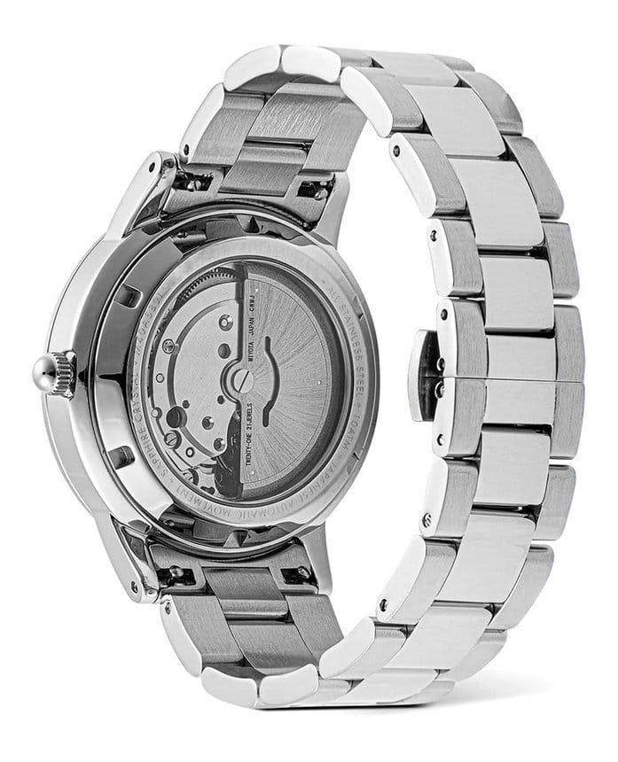 Мужские наручные часы Daniel Wellington DW00100754 из коллекции Iconic Automatic сочетают в себе элегантный дизайн и современные технологии . Модель обладает круглым корпусом диаметром 40 мм, выполненным из высококачественной нержавеющей стали, что обеспечивает надежность и устойчивость к внешним воздействиям . Толщина корпуса составляет 9,5 мм, а циферблат защищен сапфировым стекломСапфировое стеклоПрочный и надёжный материал из кристалла сапфира синтетического происхождения, характеризующийся особой твёрдостью и устойчивостью к царапинам и повреждениям., устойчивым к царапинам и механическим повреждениям. Циферблат белого цвета украшен геометрическим узором и оснащен окном даты с увеличительной линзой для удобства считывания информации . Часы работают на японском автоматическом механизме, который поддерживается движением запястья, обеспечивая точность хода без необходимости использования батарейки . Браслет выполнен из нержавеющей стали серебристого цвета, что добавляет модели элегантности и делает ее подходящей как для повседневного использования, так и для официальных мероприятий . Застежка браслета выполнена в виде застёжки «бабочка» с кнопкамиЗастёжка "бабочка"Такой вид застёжки дополняется предохранителями, помогающими избежать случайного раскрытия браслета. Обладают изящным исполнением. , гарантирующей комфортное ношение и безопасность . Корпус часов оснащен прозрачной задней крышкой, позволяющей наблюдать за работой механизма, а также винтовой коронкой, обеспечивающей водонепроницаемость до 100 метров .