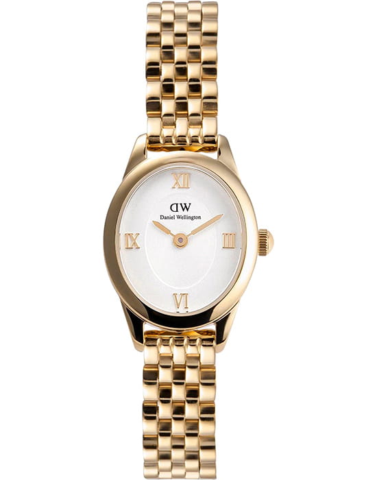 Daniel Wellington Ophelia — женственные часы с овальным корпусом 22 мм из нержавеющей стали с изящным PVDPVDУльтратонкое покрытие наносится в технике вакуумного напыления, сочетает в себе нитрид титана особой прочности со слоем золота или оксида хрома. Несёт в себе декоративную или защитную функцию.-покрытием в цвете золота. Глубокий циферблат с радиальным переливом украшен римскими индексами, что придаёт образу классическую элегантность.