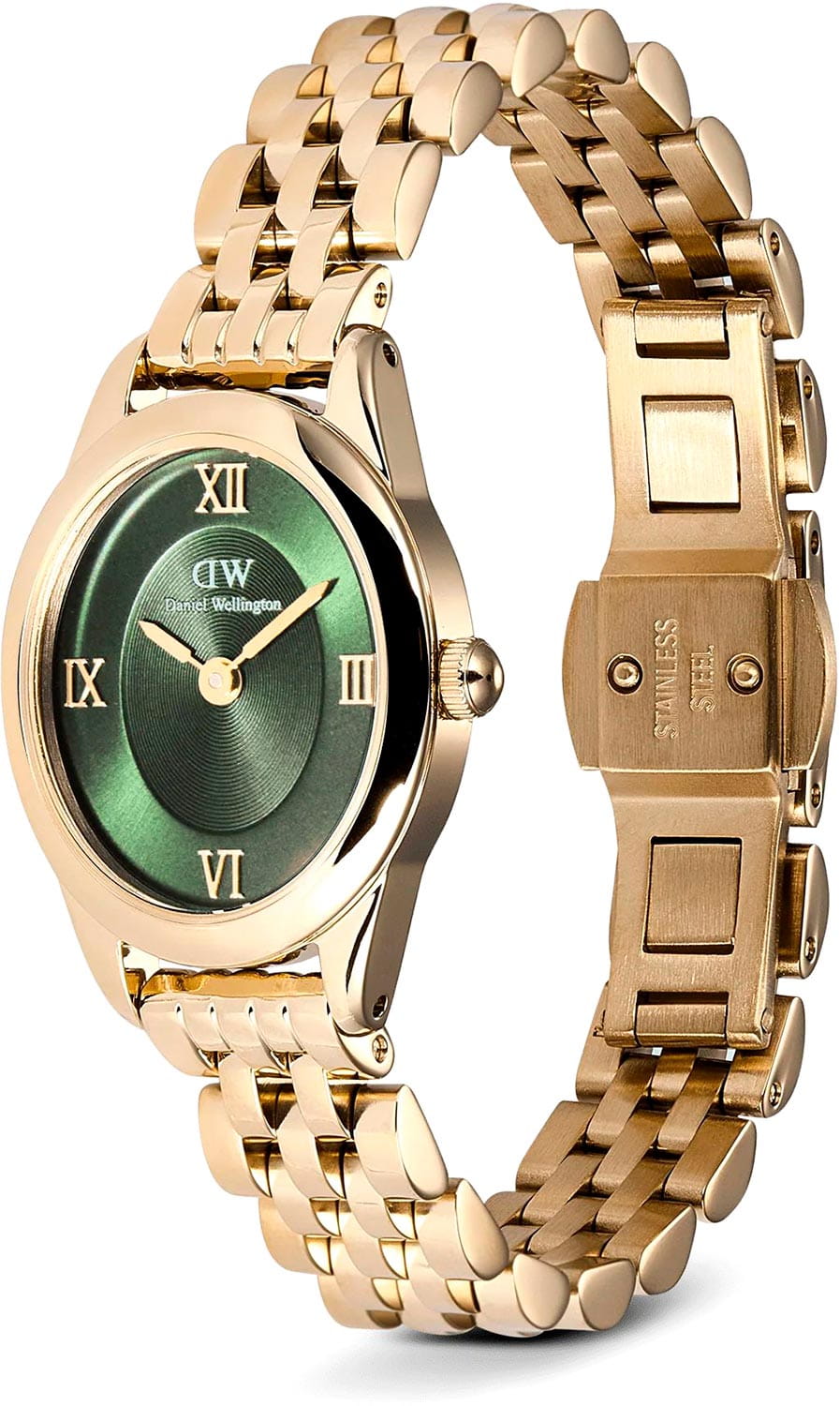 Daniel Wellington Ophelia — женственные часы с овальным корпусом 22 мм из нержавеющей стали с изящным PVDPVDУльтратонкое покрытие наносится в технике вакуумного напыления, сочетает в себе нитрид титана особой прочности со слоем золота или оксида хрома. Несёт в себе декоративную или защитную функцию.-покрытием в цвете золота. Глубокий циферблат с радиальным переливом украшен римскими индексами, что придаёт образу классическую элегантность.