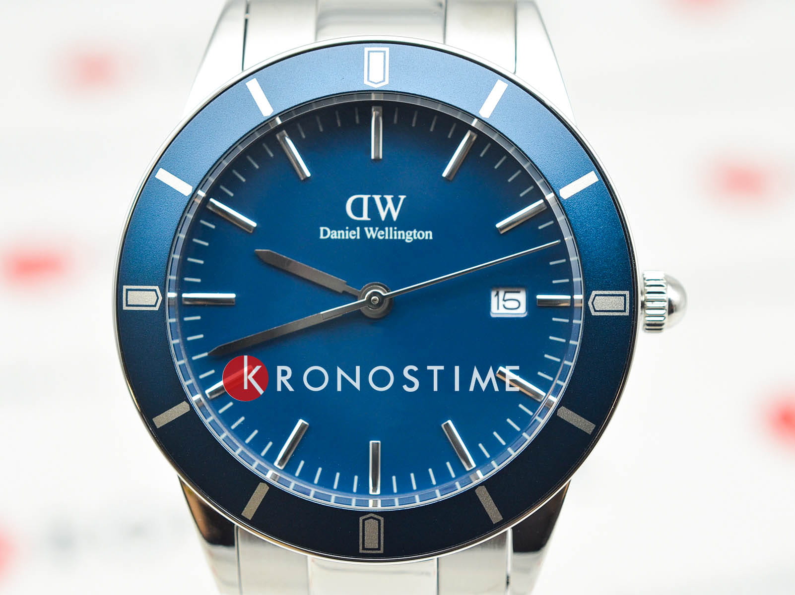 Daniel Wellington — мужские часы в современном спортивно-элегантном стиле. Круглый корпус диаметром 40 мм изготовлен из нержавеющей стали и дополнен синим безелемБезельВнешний ободок, закрепляющий стекло. В спортивных часах так называется поворотное кольцо с делениями на циферблате, выполняет роль таймера – замеряет отрезки времени на шкале. Неподвижный безель – элемент декора. Однонаправленно вращающийся безель на дайверских часах позволяет фиксировать моменты погружения и выныривания на поверхность. из анодированного алюминия, которое придаёт модели выразительный характер.