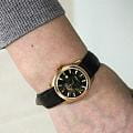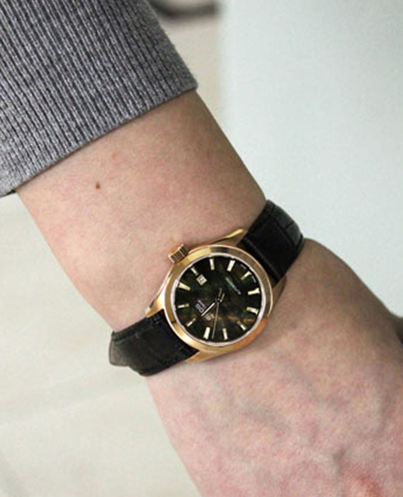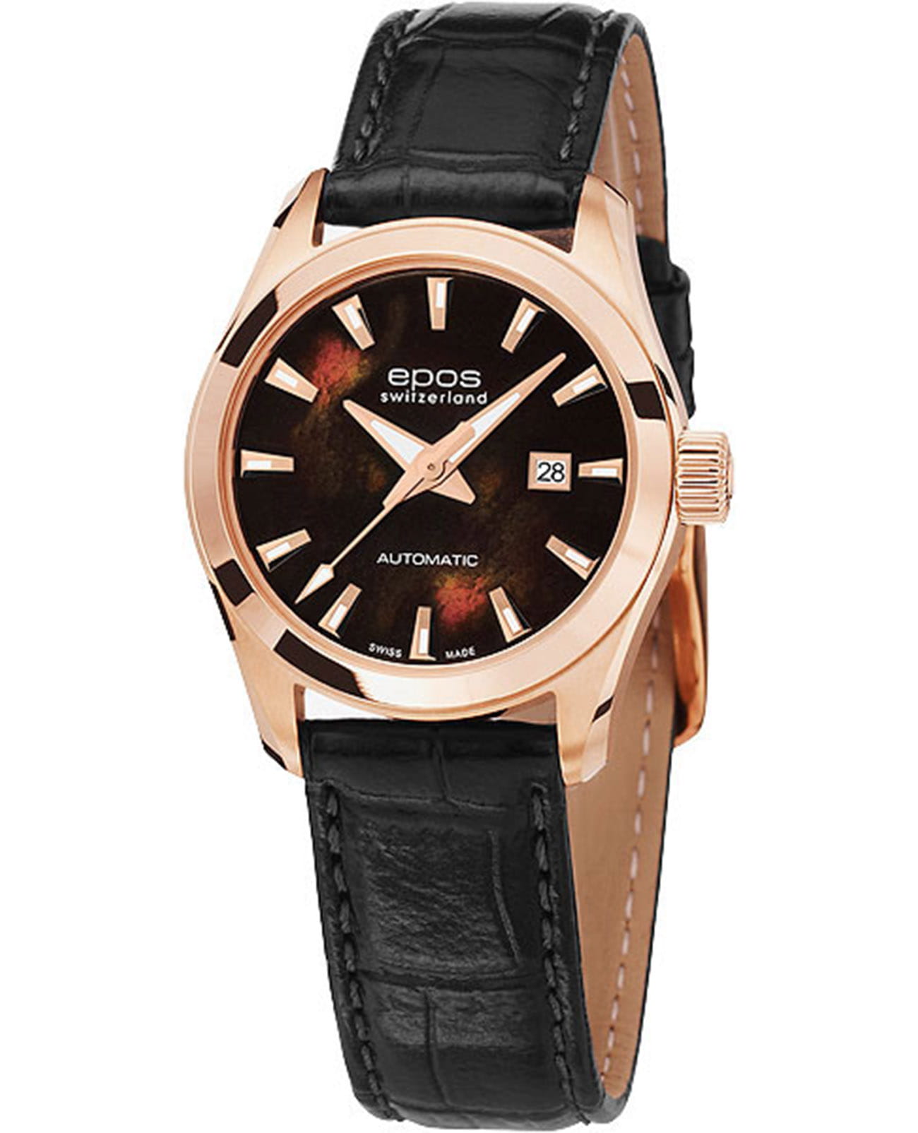 Женские механические часы с автоподзаводом Epos — это изысканный аксессуар швейцарского производства. Корпус диаметром 29 мм и толщиной 8 мм выполнен из нержавеющей стали с PVD-покрытиемPVDУльтратонкое покрытие наносится в технике вакуумного напыления, сочетает в себе нитрид титана особой прочности со слоем золота или оксида хрома. Несёт в себе декоративную или защитную функцию. цвета розового золота. Циферблат перламутрового чёрного цвета оформлен индексами и стрелками. Стрелки с люминесцентным покрытиемЛюминесцентное покрытиеПозволяет считывать показания времени в темноте. Производители наносят на стрелки, часовые индексы, безель или поверхность циферблата светонакопительный состав, дающий холодное свечение., обеспечивающим хорошую читаемость в темноте. Окошко даты расположено в положении 3 часов. Циферблат защищён сапфировым стекломСапфировое стеклоПрочный и надёжный материал из кристалла сапфира синтетического происхождения, характеризующийся особой твёрдостью и устойчивостью к царапинам и повреждениям. с антибликовым покрытиемАнтибликовое покрытиеСлой оксида металла в 0,13-0,3 микрон, благодаря которому стекло часов не бликует и не отражает свет. Антибликовое покрытие уменьшает отражение света в 10 раз, обеспечивая отличную читаемость показателей циферблата.. Прозрачная задняя крышка позволяет наблюдать за работой механизма. Часы оснащены кожаным ремешком на застёжке «бабочка» с кнопкамиЗастёжка "бабочка"Такой вид застёжки дополняется предохранителями, помогающими избежать случайного раскрытия браслета. Обладают изящным исполнением. . Водонепроницаемость 30 м позволяет использовать часы в повседневных условиях. Идеальный выбор для тех, кто ценит швейцарское качество и элегантность.