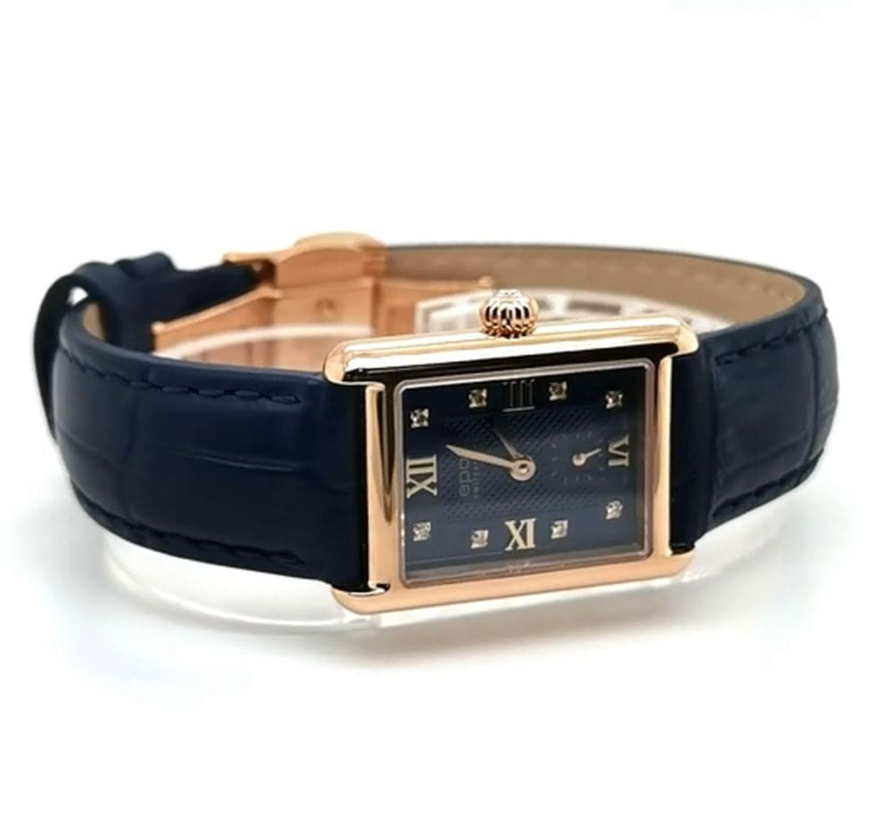Epos 8002.702.24.86.16 — женская модель с утончённым классическим стилем и прямоугольным корпусом, выполненным из нержавеющей стали с PVD-покрытиемPVDУльтратонкое покрытие наносится в технике вакуумного напыления, сочетает в себе нитрид титана особой прочности со слоем золота или оксида хрома. Несёт в себе декоративную или защитную функцию.. Черный циферблат оформлен римскими индексами и утончённым узором «Clous de Paris», создающим игру света и подчёркивающим глубину дизайна. Защитную функцию выполняет сапфировое стеклоСапфировое стеклоПрочный и надёжный материал из кристалла сапфира синтетического происхождения, характеризующийся особой твёрдостью и устойчивостью к царапинам и повреждениям., стойкое к царапинам и сохраняющее прозрачность. В основе лежит швейцарский автоматический механизм, обеспечивающий стабильность и точность хода. Функции включают индикацию часов, минут и малую секундную шкалу, расположенную в позиции «6 часов». Часы дополнены кожаным ремешком, который гармонично завершает строгий образ модели.