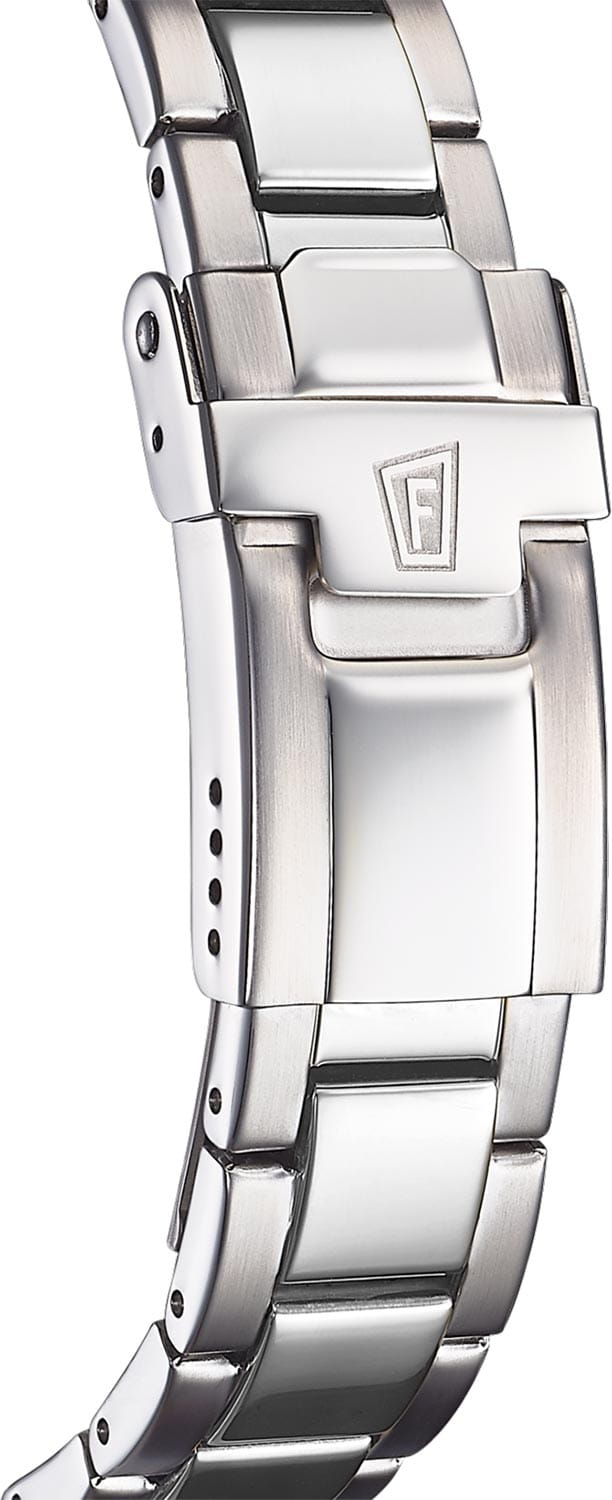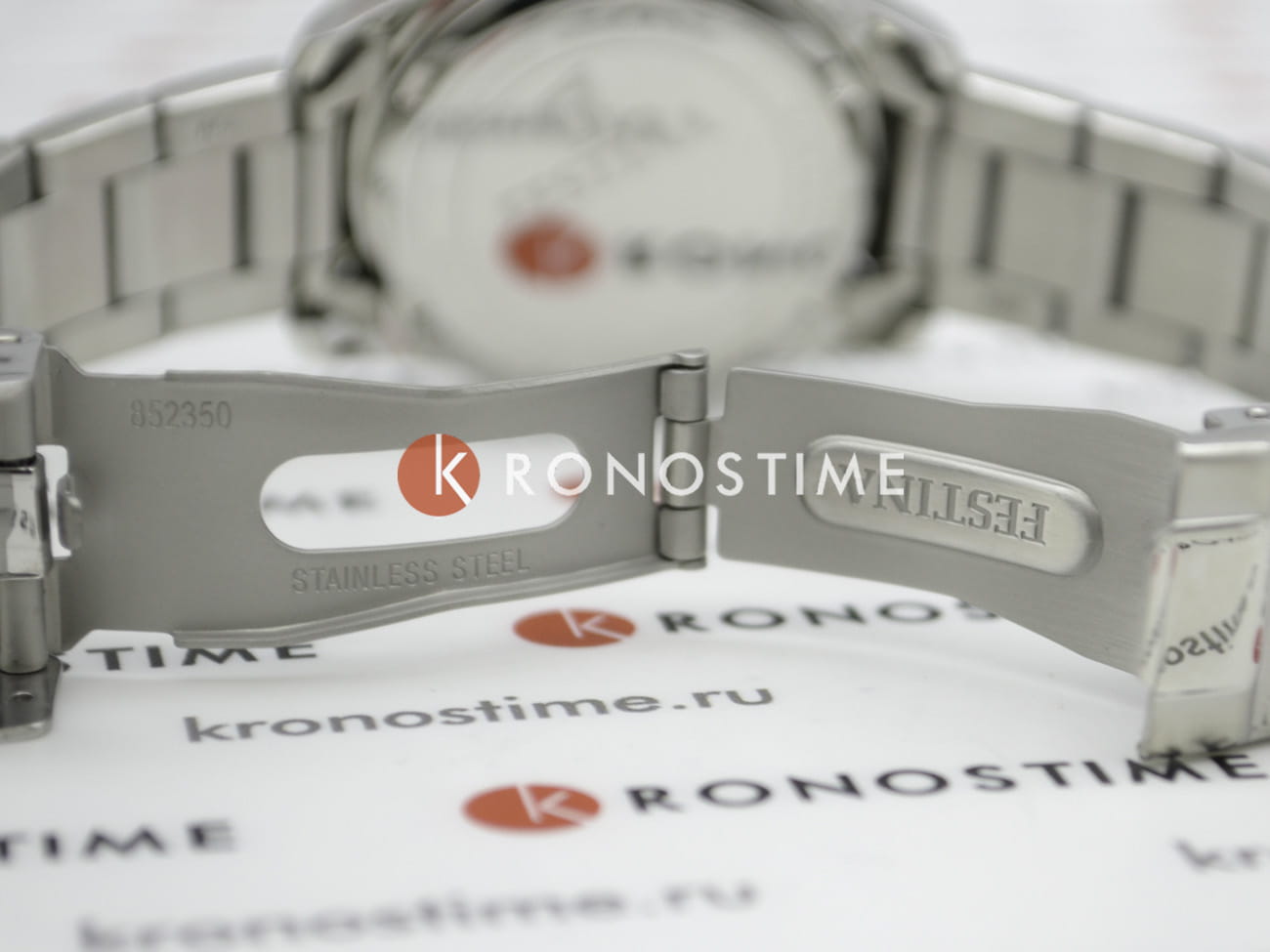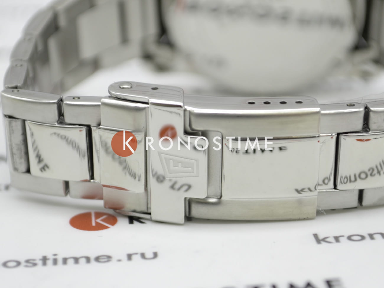 Кварцевый механизм с высокой точностью. Минеральное стеклоМинеральное стеклоМинеральное стекло представляет собой искусственно выращенный минерал кварца. Такое стекло отличается особой устойчивостью к повреждениям и царапинам. Уступает по некоторым качествам сапфировому стеклу. устойчивое к появлению царапин, обладающее высокой прозрачностью. Стрелки с люминесцентным покрытиемЛюминесцентное покрытиеПозволяет считывать показания времени в темноте. Производители наносят на стрелки, часовые индексы, безель или поверхность циферблата светонакопительный состав, дающий холодное свечение.. Циферблат инкрустирован кристаллами. Окошко даты с увеличительным стеклом. Класс водозащиты: 100 метров, позволит плавать, нырять и заниматься другими водными видами спорта. Поворотный безельБезельВнешний ободок, закрепляющий стекло. В спортивных часах так называется поворотное кольцо с делениями на циферблате, выполняет роль таймера – замеряет отрезки времени на шкале. Неподвижный безель – элемент декора. Однонаправленно вращающийся безель на дайверских часах позволяет фиксировать моменты погружения и выныривания на поверхность.. Корпус часов изготовлен из нержавеющей стали. Браслет с раскладной застёжкойРаскладная застёжкаТакой тип застёжки используется только на браслетах из металла. Она никогда не раскрывается полностью, происходит разделение на 2 и более частей. Раскладывающая застёжка снизит вероятность потери часов к минимуму.. Застежка с системой блокировки.