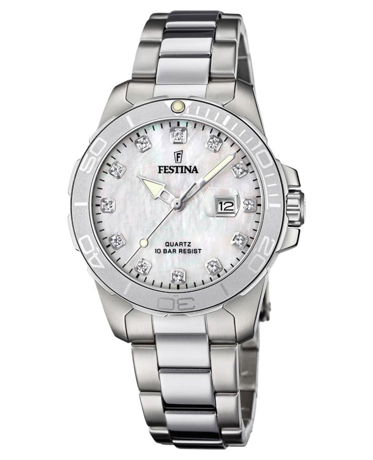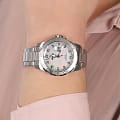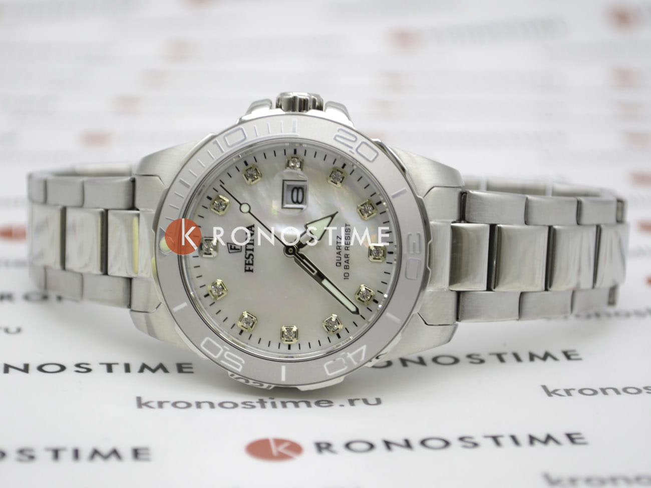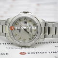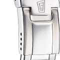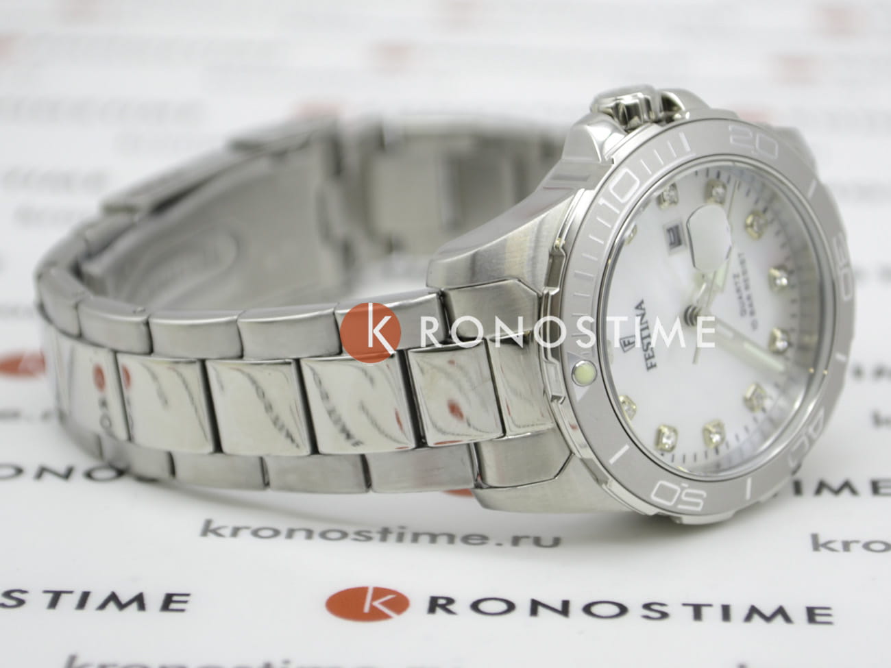 Кварцевый механизм с высокой точностью. Минеральное стеклоМинеральное стеклоМинеральное стекло представляет собой искусственно выращенный минерал кварца. Такое стекло отличается особой устойчивостью к повреждениям и царапинам. Уступает по некоторым качествам сапфировому стеклу. устойчивое к появлению царапин, обладающее высокой прозрачностью. Стрелки с люминесцентным покрытиемЛюминесцентное покрытиеПозволяет считывать показания времени в темноте. Производители наносят на стрелки, часовые индексы, безель или поверхность циферблата светонакопительный состав, дающий холодное свечение.. Циферблат инкрустирован кристаллами. Окошко даты с увеличительным стеклом. Класс водозащиты: 100 метров, позволит плавать, нырять и заниматься другими водными видами спорта. Поворотный безельБезельВнешний ободок, закрепляющий стекло. В спортивных часах так называется поворотное кольцо с делениями на циферблате, выполняет роль таймера – замеряет отрезки времени на шкале. Неподвижный безель – элемент декора. Однонаправленно вращающийся безель на дайверских часах позволяет фиксировать моменты погружения и выныривания на поверхность.. Корпус часов изготовлен из нержавеющей стали. Браслет с раскладной застёжкойРаскладная застёжкаТакой тип застёжки используется только на браслетах из металла. Она никогда не раскрывается полностью, происходит разделение на 2 и более частей. Раскладывающая застёжка снизит вероятность потери часов к минимуму.. Застежка с системой блокировки.