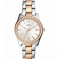 Кварцевые часы. Корпус и браслет шириной 16 мм выполнены из нержавеющей стали с частичным IP покрытием. Корпус украшен кристаллами. Серебристый циферблат с центральной секундной стрелкой. Индикация даты в позиции трех часов.