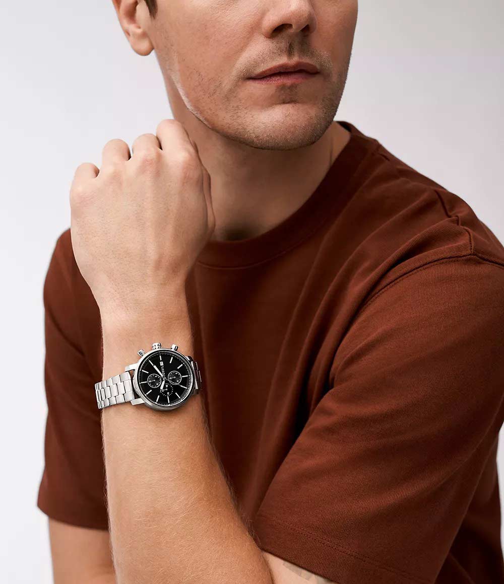 Часы Fossil Rhett BQ2851 идеально подойдут для тех, кто ценит классический стиль, дополненный современными деталями, и ищет аксессуар, способный подчеркнуть их индивидуальность и элегантность. Эти мужские наручные часы производятся в США и оснащены надежным кварцевым механизмом, который обеспечивает точность и стабильность в работе. Корпус из нержавеющей стали диаметром 42 мм гарантирует долговечность и придает часам стильный и современный вид. Циферблат, выполненный по технологии Sunray, создает эффект солнечных лучей, что добавляет глубину и изысканность дизайну. Метки в виде штрихов придают циферблату классический акцент, а рифленая заводная головка облегчает настройку времени. Стрелки и метки с люминесцентным покрытиемЛюминесцентное покрытиеПозволяет считывать показания времени в темноте. Производители наносят на стрелки, часовые индексы, безель или поверхность циферблата светонакопительный состав, дающий холодное свечение. позволяют легко считывать время даже в условиях низкой освещенности. Стальной браслет на раскладной застёжкеРаскладная застёжкаТакой тип застёжки используется только на браслетах из металла. Она никогда не раскрывается полностью, происходит разделение на 2 и более частей. Раскладывающая застёжка снизит вероятность потери часов к минимуму. обеспечивает комфортное ношение и надежную фиксацию на запястье. Водозащита уровня 50WR защищает механизм от случайных брызг, а минеральное стеклоМинеральное стеклоМинеральное стекло представляет собой искусственно выращенный минерал кварца. Такое стекло отличается особой устойчивостью к повреждениям и царапинам. Уступает по некоторым качествам сапфировому стеклу. оберегает циферблат от царапин и повреждений. 12-ти и 24-х часовой формат времени. Второй часовой поясВторой часовой поясФункция, позволяющая отображать время двух часовых поясов одновременно. в 24-х часовом формате.