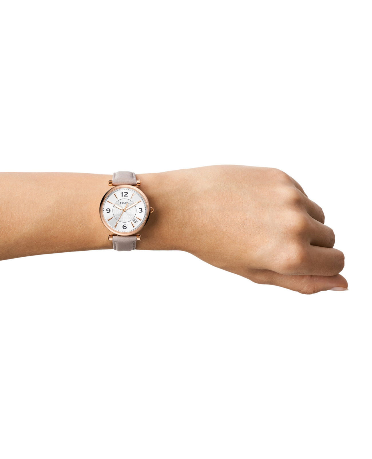 Женские американские часы с минеральным стекломМинеральное стеклоМинеральное стекло представляет собой искусственно выращенный минерал кварца. Такое стекло отличается особой устойчивостью к повреждениям и царапинам. Уступает по некоторым качествам сапфировому стеклу. Fossil Carlie ES5161, кварцевый механизм с высокой точностью. Корпус часов изготовлен из нержавеющей стали с IP-покрытиемIP-покрытиеМетод ионного напыления. Демонстрирует повышенную устойчивость к истиранию, окислению и химическим веществам. Под воздействием высокого давления и температуры около 1500°C молекулы металла надёжно соединяются с частицами корпуса часов.. Метки в виде арабских цифр и штрихов. Окошко даты на 4,5 часа. Стрелки с люминесцентным покрытиемЛюминесцентное покрытиеПозволяет считывать показания времени в темноте. Производители наносят на стрелки, часовые индексы, безель или поверхность циферблата светонакопительный состав, дающий холодное свечение.. Рифленая заводная головка с защитой. Класс водозащиты: 50 метров, позволит защитить корпус от случайных брызг или капель дождя. Кожаный ремешок на стандартной застежке.