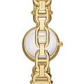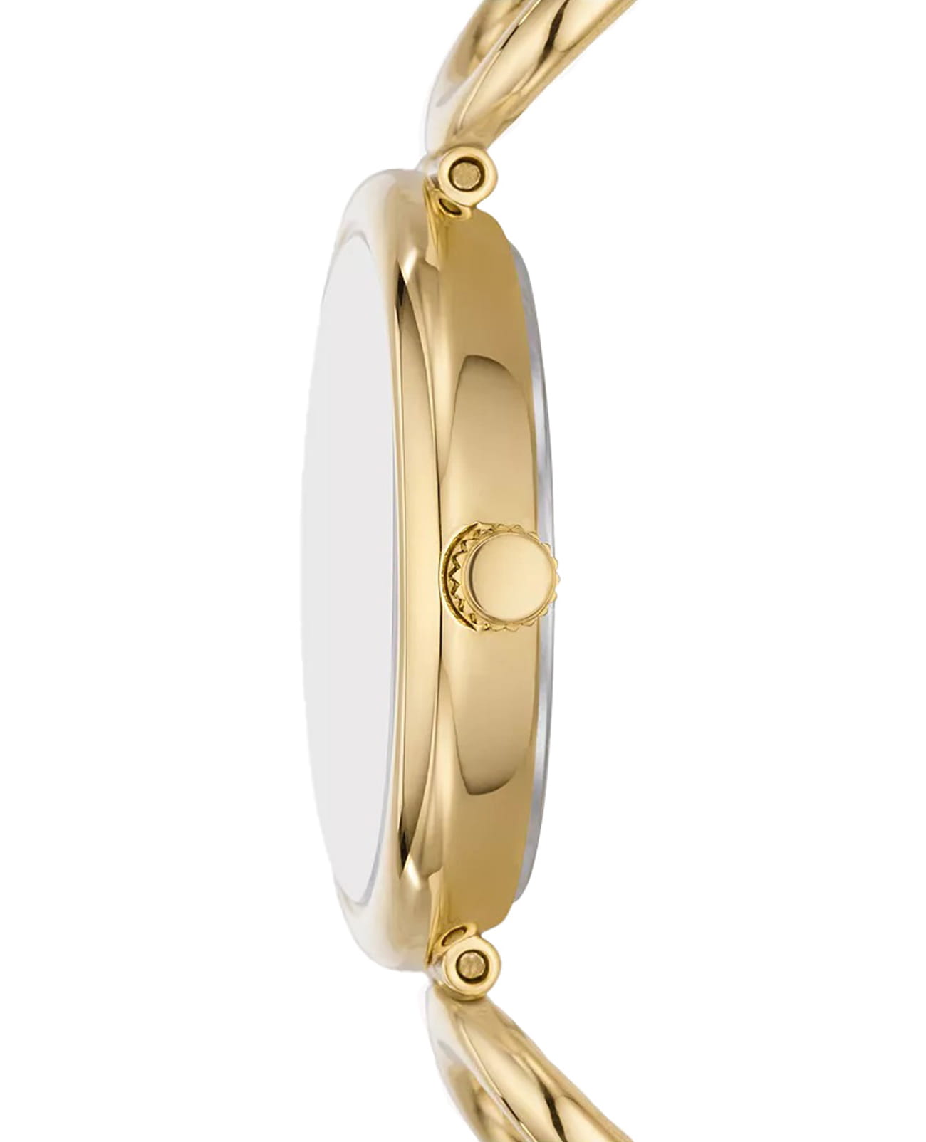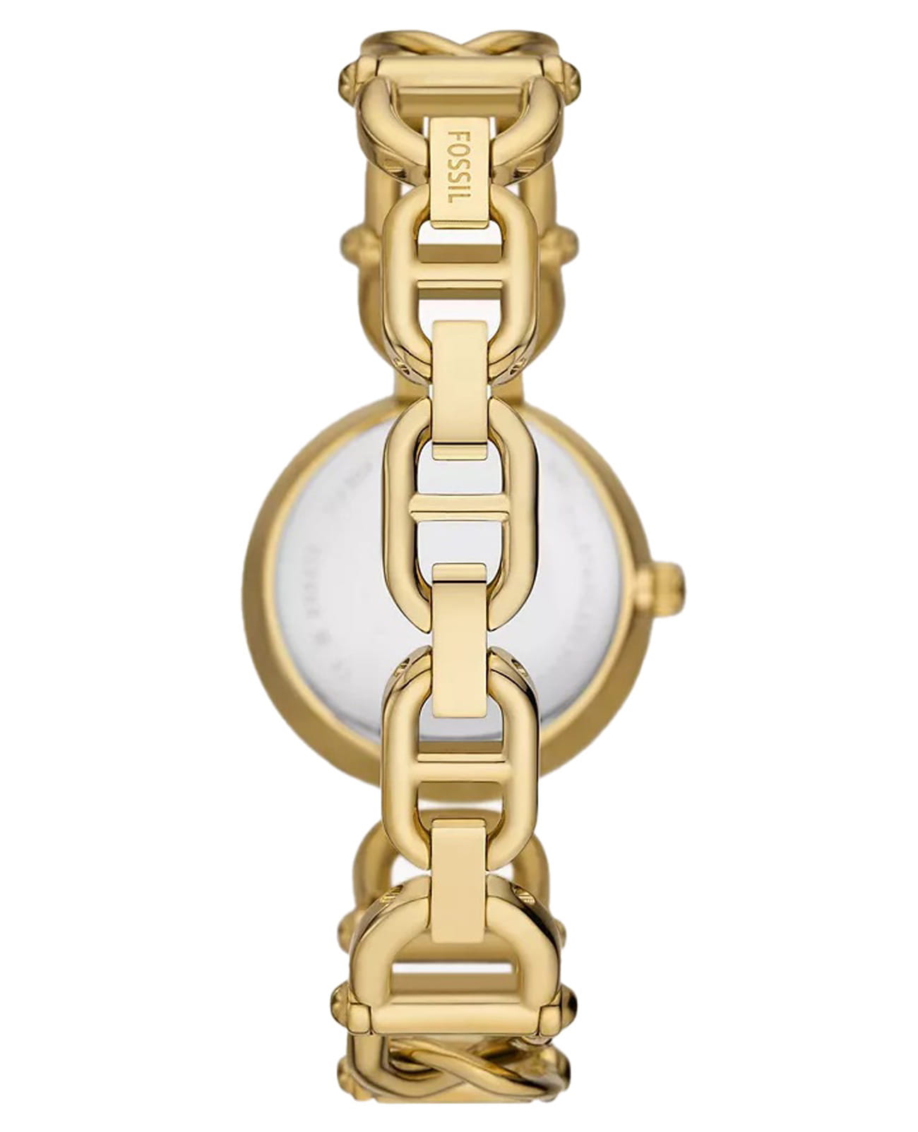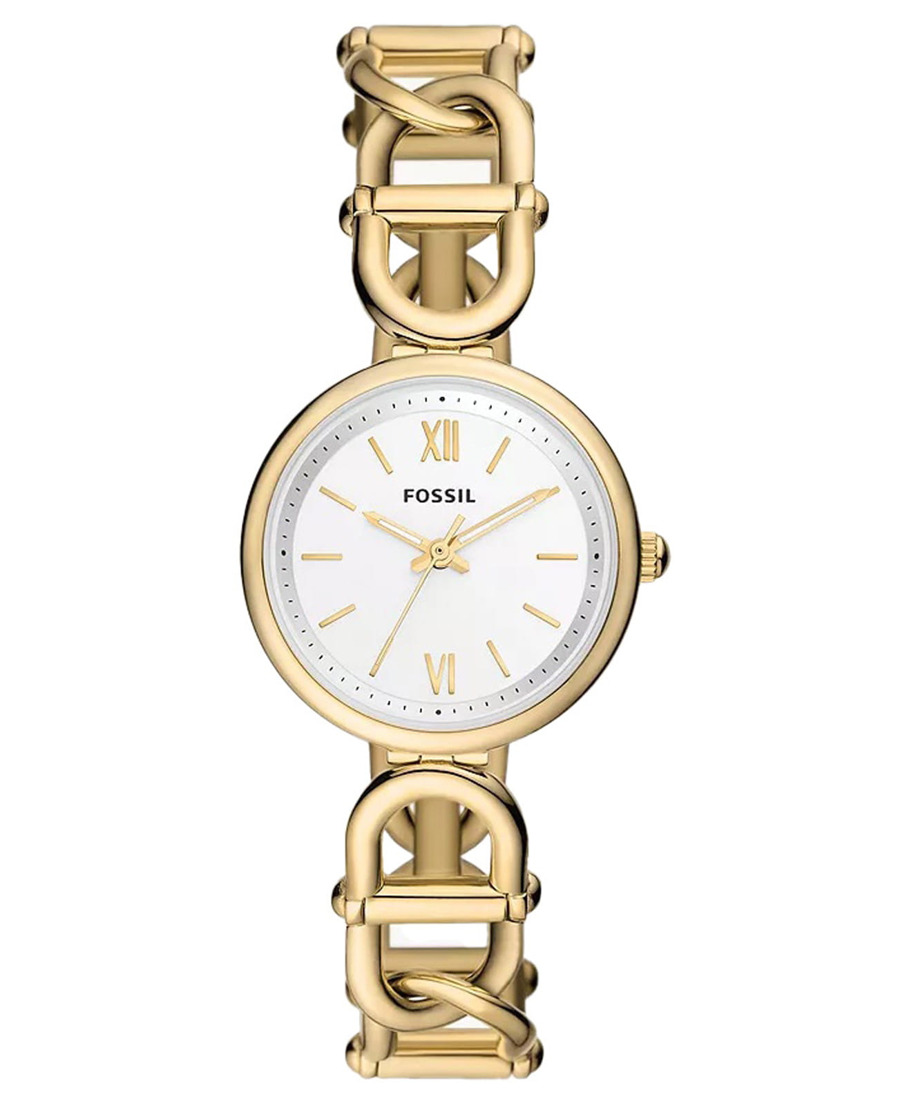 Женские американские часы  с минеральным стекломМинеральное стеклоМинеральное стекло представляет собой искусственно выращенный минерал кварца. Такое стекло отличается особой устойчивостью к повреждениям и царапинам. Уступает по некоторым качествам сапфировому стеклу. Fossil Carlie ES5272, кварцевый механизм с высокой точностью. Корпус и браслет часов изготовлены из нержавеющей стали  с IP-покрытиемIP-покрытиеМетод ионного напыления. Демонстрирует повышенную устойчивость к истиранию, окислению и химическим веществам. Под воздействием высокого давления и температуры около 1500°C молекулы металла надёжно соединяются с частицами корпуса часов.. Стрелки с люминесцентным покрытиемЛюминесцентное покрытиеПозволяет считывать показания времени в темноте. Производители наносят на стрелки, часовые индексы, безель или поверхность циферблата светонакопительный состав, дающий холодное свечение.. Рифленая заводная головка с защитой. Класс водозащиты: 50 метров, позволит защитить корпус от случайных брызг или капель дождя. Стальной браслет в виде звеньев на ювелирной застежке.