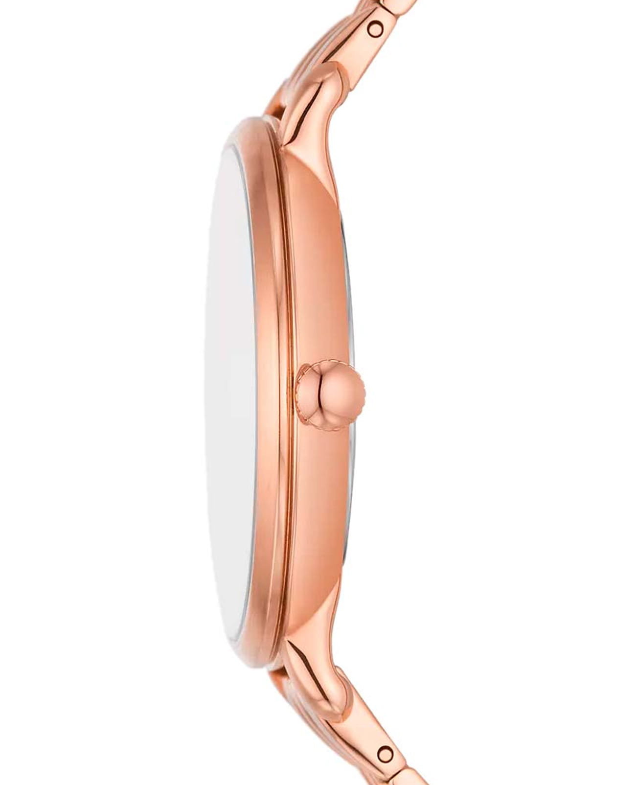 Женские американские часы с минеральным стекломМинеральное стеклоМинеральное стекло представляет собой искусственно выращенный минерал кварца. Такое стекло отличается особой устойчивостью к повреждениям и царапинам. Уступает по некоторым качествам сапфировому стеклу. Fossil Jacqueline ES5275, кварцевый механизм с высокой точностью. Корпус и браслет часов изготовлены из нержавеющей стали с IP-покрытиемIP-покрытиеМетод ионного напыления. Демонстрирует повышенную устойчивость к истиранию, окислению и химическим веществам. Под воздействием высокого давления и температуры около 1500°C молекулы металла надёжно соединяются с частицами корпуса часов.. Перламутровый циферблат украшен объемным изображением цветов. Метки в виде штрихов и римской цифры XII. Окошко даты находится в положении 3 часа. Рифленая заводная головка с защитой. Класс водозащиты: 30 метров, позволит защитить корпус от случайных брызг или капель дождя. Стальной браслет на раскладной застёжкеРаскладная застёжкаТакой тип застёжки используется только на браслетах из металла. Она никогда не раскрывается полностью, происходит разделение на 2 и более частей. Раскладывающая застёжка снизит вероятность потери часов к минимуму..