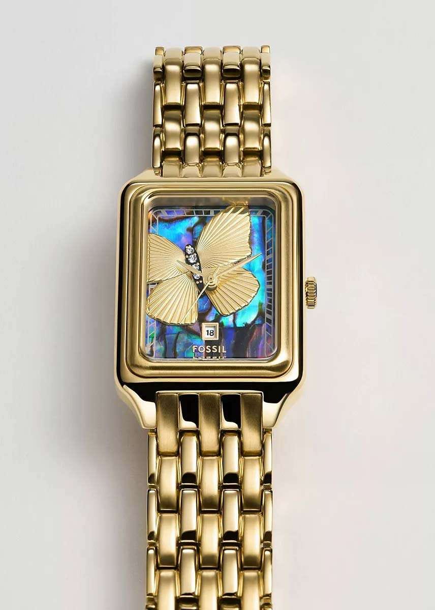 Женские кварцевые часы Fossil — это элегантный аксессуар с изысканным дизайном. Корпус прямоугольной формы шириной 26 мм выполнен из стали с IP-покрытиемIP-покрытиеМетод ионного напыления. Демонстрирует повышенную устойчивость к истиранию, окислению и химическим веществам. Под воздействием высокого давления и температуры около 1500°C молекулы металла надёжно соединяются с частицами корпуса часов.. Циферблат перламутрового чёрного цвета оформлен штрихами и украшен кристаллами, а также декоративной золотистой бабочкой. Окошко даты расположено в положении 6 часов. Циферблат защищён минеральным стекломМинеральное стеклоМинеральное стекло представляет собой искусственно выращенный минерал кварца. Такое стекло отличается особой устойчивостью к повреждениям и царапинам. Уступает по некоторым качествам сапфировому стеклу.. Часы оснащены стальным браслетом с IP-покрытиемIP-покрытиеМетод ионного напыления. Демонстрирует повышенную устойчивость к истиранию, окислению и химическим веществам. Под воздействием высокого давления и температуры около 1500°C молекулы металла надёжно соединяются с частицами корпуса часов. на раскладной застёжкеРаскладная застёжкаТакой тип застёжки используется только на браслетах из металла. Она никогда не раскрывается полностью, происходит разделение на 2 и более частей. Раскладывающая застёжка снизит вероятность потери часов к минимуму.. Водонепроницаемость 50 м позволяет использовать часы для плавания и повседневного ношения. Идеальный выбор для тех, кто ценит американское качество и женственный дизайн.