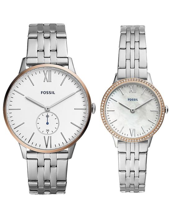Парный комплект часов Fossil Rye His and Her Multifunction Stainless Steel Watch Set FS5562SET, кварцевый механизм с высокой точностью. Минеральное стеклоМинеральное стеклоМинеральное стекло представляет собой искусственно выращенный минерал кварца. Такое стекло отличается особой устойчивостью к повреждениям и царапинам. Уступает по некоторым качествам сапфировому стеклу. устойчивое к мелким механическим повреждениям. Класс водозащиты: 30 метров, позволит защитить корпус от случайных брызг или капель дождя. Корпус часов изготовлен из стали. БезельБезельВнешний ободок, закрепляющий стекло. В спортивных часах так называется поворотное кольцо с делениями на циферблате, выполняет роль таймера – замеряет отрезки времени на шкале. Неподвижный безель – элемент декора. Однонаправленно вращающийся безель на дайверских часах позволяет фиксировать моменты погружения и выныривания на поверхность. из нержавеющей стали с IP-покрытиемIP-покрытиеМетод ионного напыления. Демонстрирует повышенную устойчивость к истиранию, окислению и химическим веществам. Под воздействием высокого давления и температуры около 1500°C молекулы металла надёжно соединяются с частицами корпуса часов.. На мужских часах, секундная стрелка вынесена на малый циферблат. БезельБезельВнешний ободок, закрепляющий стекло. В спортивных часах так называется поворотное кольцо с делениями на циферблате, выполняет роль таймера – замеряет отрезки времени на шкале. Неподвижный безель – элемент декора. Однонаправленно вращающийся безель на дайверских часах позволяет фиксировать моменты погружения и выныривания на поверхность. женской модели украшен кристаллами. Метки в виде штрихов и римских цифр. Ширина корпуса для мужских часов: 42мм, для женских часов: 30мм. Рифленая заводная головка. Стальной браслет на раскладной застёжкеРаскладная застёжкаТакой тип застёжки используется только на браслетах из металла. Она никогда не раскрывается полностью, происходит разделение на 2 и более частей. Раскладывающая застёжка снизит вероятность потери часов к минимуму.. Ширина браслета для мужских часов: 20мм, для женских часов: 14мм.