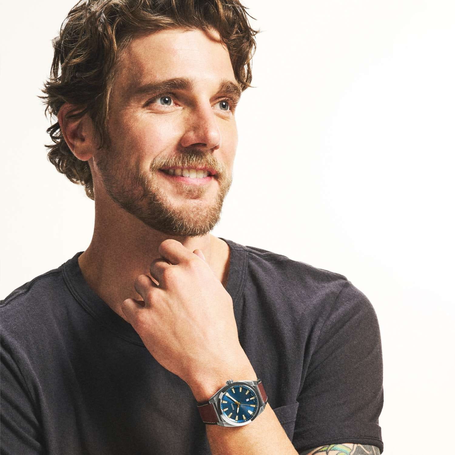 Мужские кварцевые часы Fossil — это стильный аксессуар для повседневного ношения. Корпус диаметром 42 мм выполнен из нержавеющей стали. Циферблат синего цвета оформлен индексами и стрелками, включая центральную секундную стрелку. Окошко даты расположено в положении 6 часов. Циферблат защищён минеральным стекломМинеральное стеклоМинеральное стекло представляет собой искусственно выращенный минерал кварца. Такое стекло отличается особой устойчивостью к повреждениям и царапинам. Уступает по некоторым качествам сапфировому стеклу.. Часы оснащены коричневым кожаным ремешком шириной 18 мм на классической пряжке. Водонепроницаемость 50 м позволяет использовать часы в повседневных условиях. Идеальный выбор для тех, кто ценит американское качество и классический дизайн.