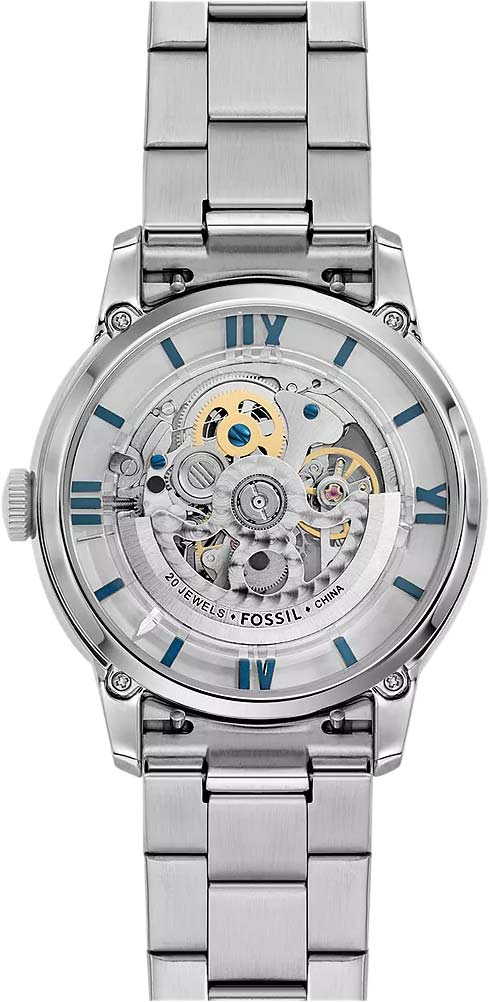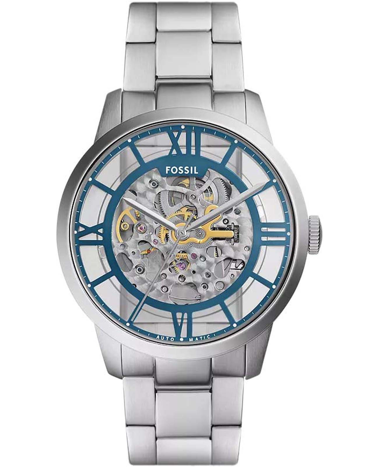 Мужские механические часы-скелетоны с минеральным стекломМинеральное стеклоМинеральное стекло представляет собой искусственно выращенный минерал кварца. Такое стекло отличается особой устойчивостью к повреждениям и царапинам. Уступает по некоторым качествам сапфировому стеклу. Fossil Townsman ME3260, механический механизм (автоматический калибр) с высокой точностью. Класс водозащиты: 50 метров, позволит защитить корпус от случайных брызг или капель дождя. Корпус часов изготовлен из стали с IP-покрытиемIP-покрытиеМетод ионного напыления. Демонстрирует повышенную устойчивость к истиранию, окислению и химическим веществам. Под воздействием высокого давления и температуры около 1500°C молекулы металла надёжно соединяются с частицами корпуса часов.. Метки выполнены в виде римских цифр. Рифленая заводная головка расположена с правой стороны корпуса. Циферблат в виде скелета с бронзовыми элементами. Стальной браслет на раскладной застёжкеРаскладная застёжкаТакой тип застёжки используется только на браслетах из металла. Она никогда не раскрывается полностью, происходит разделение на 2 и более частей. Раскладывающая застёжка снизит вероятность потери часов к минимуму..