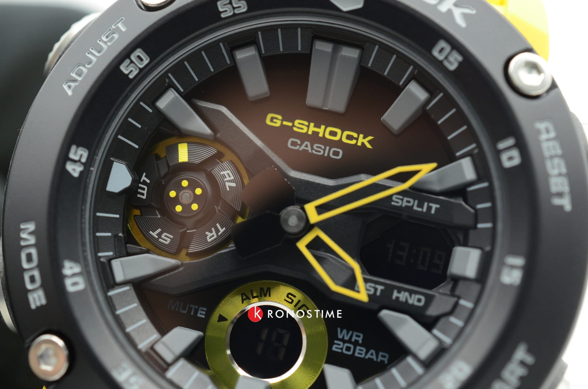 Наручные часы в чёрно-желтом исполнении реализуют технологию Carbon Core GuardCarbon Core Guard Новейшая структура корпуса, разработанная Casio. Полиуретановая пластина дополнительно усилена карбоновыми вставками, что придаёт специальную защиту от механических повреждений. Карбон отличается лёгкостью и прочностью., карбон послужил материалом для изготовления противоударного корпусаУдаропрочный корпусМеханизм заключён в корпус, выполненный из современных материалов, устойчивых к ударам, механическим повреждениям и падению с высоты: инновационный пластик, карбон, нержавеющая сталь, титан.. Это позволило добиться повышенной устойчивости к ударам и падению без утяжеления общей конструкции. БезельБезельВнешний ободок, закрепляющий стекло. В спортивных часах так называется поворотное кольцо с делениями на циферблате, выполняет роль таймера – замеряет отрезки времени на шкале. Неподвижный безель – элемент декора. Однонаправленно вращающийся безель на дайверских часах позволяет фиксировать моменты погружения и выныривания на поверхность. оставлен полимерным. Японский кварцевый механизм работает за счёт батарейки, срок службы которой - 3 года. Закаленное минеральное стекло. Двойная задняя крышка, стальная и пластиковая. Светодиодная подсветкаСветодиодная подсветкаСветодиодная или LED-подсветка обеспечивает появление яркого холодного свечения за счёт LED-элементов - маленьких лампочек. Они потребляют минимальное количество энергии, чаще всего можно встретить 1 светодиод, в нижней части циферблата.. Водонепроницаемость 200 метров. Возможность быстрой и лёгкой замены полимерного ремешка. ХронографХронографФункция позволяет измерять отрезки времени с особой точностью: часы, минуты, секунды. Верным признаком хронографа является наличие на циферблате 3 дополнительных окошек-счётчиков., автоматический календарь, мировое времяМировое время Полезное часовое усложнение, отображающее время в основных городах и известных областях по всему миру, оно связано с часовыми поясами, удобно для путешественников и бизнесменов. , будильник, секундомер, таймер с автоповтором. Габариты: 48,7 x 51,2 x 14,1 мм.