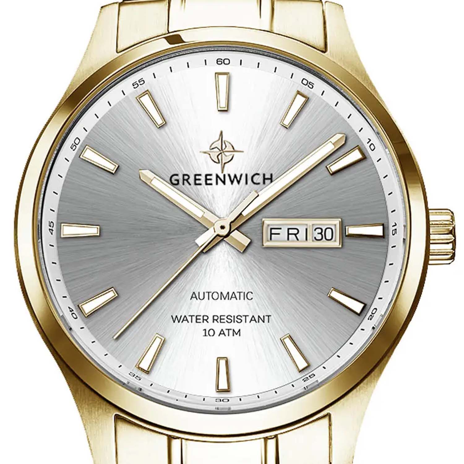 Мужские часы Greenwich Good Luck GW 054.20.33, механический механизм (автоматический калибр) с высокой точностью. Классический круглый стальной корпус с PVD-покрытиемPVDУльтратонкое покрытие наносится в технике вакуумного напыления, сочетает в себе нитрид титана особой прочности со слоем золота или оксида хрома. Несёт в себе декоративную или защитную функцию., защищенный минеральным стекломМинеральное стеклоМинеральное стекло представляет собой искусственно выращенный минерал кварца. Такое стекло отличается особой устойчивостью к повреждениям и царапинам. Уступает по некоторым качествам сапфировому стеклу.. Стрелки и метки с люминесцентным покрытиемЛюминесцентное покрытиеПозволяет считывать показания времени в темноте. Производители наносят на стрелки, часовые индексы, безель или поверхность циферблата светонакопительный состав, дающий холодное свечение.. Стальной браслет на раскладной застёжкеРаскладная застёжкаТакой тип застёжки используется только на браслетах из металла. Она никогда не раскрывается полностью, происходит разделение на 2 и более частей. Раскладывающая застёжка снизит вероятность потери часов к минимуму.. Класс водозащиты: 100 метров, позволит плавать, нырять и заниматься другими водными видами спорта. Окошко даты и дня недели находится в положении 3 часа.