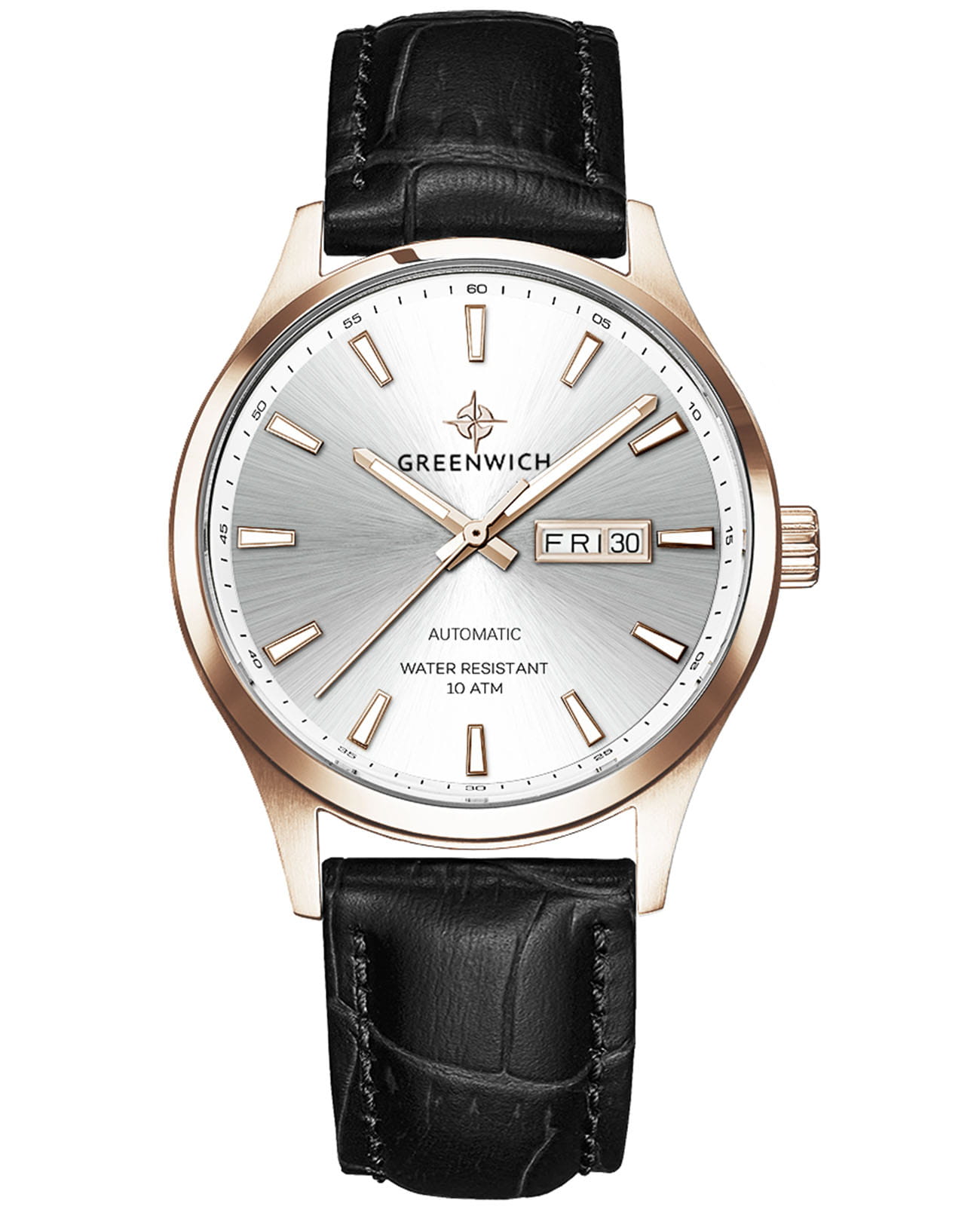 Мужские часы Greenwich Good Luck GW 054.41.33, механический механизм (автоматический калибр) с высокой точностью. Классический круглый стальной корпус с PVD-покрытиемPVDУльтратонкое покрытие наносится в технике вакуумного напыления, сочетает в себе нитрид титана особой прочности со слоем золота или оксида хрома. Несёт в себе декоративную или защитную функцию., защищенный минеральным стекломМинеральное стеклоМинеральное стекло представляет собой искусственно выращенный минерал кварца. Такое стекло отличается особой устойчивостью к повреждениям и царапинам. Уступает по некоторым качествам сапфировому стеклу.. Стрелки и метки с люминесцентным покрытиемЛюминесцентное покрытиеПозволяет считывать показания времени в темноте. Производители наносят на стрелки, часовые индексы, безель или поверхность циферблата светонакопительный состав, дающий холодное свечение.. Кожаный ремешок на стандартной застёжке. Класс водозащиты: 100 метров, позволит плавать, нырять и заниматься другими водными видами спорта. Окошко даты и дня недели находится в положении 3 часа.