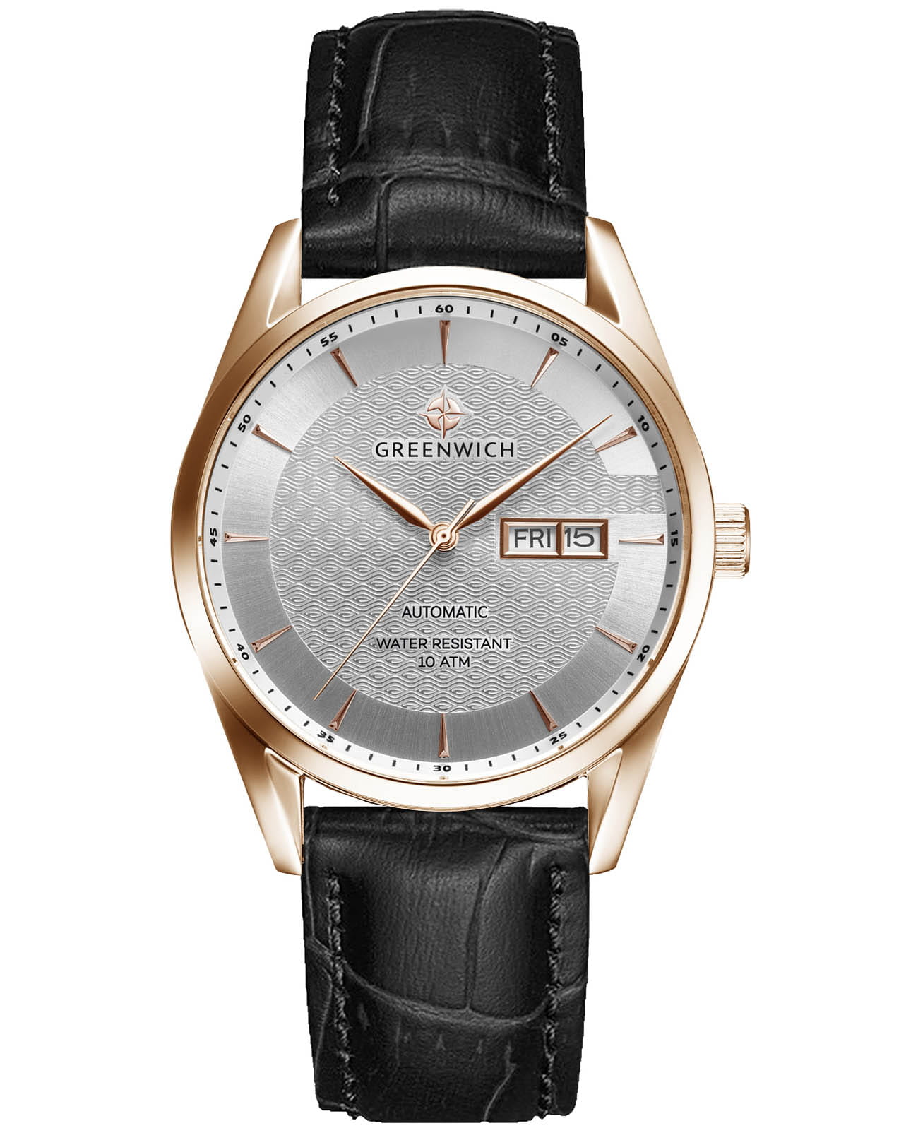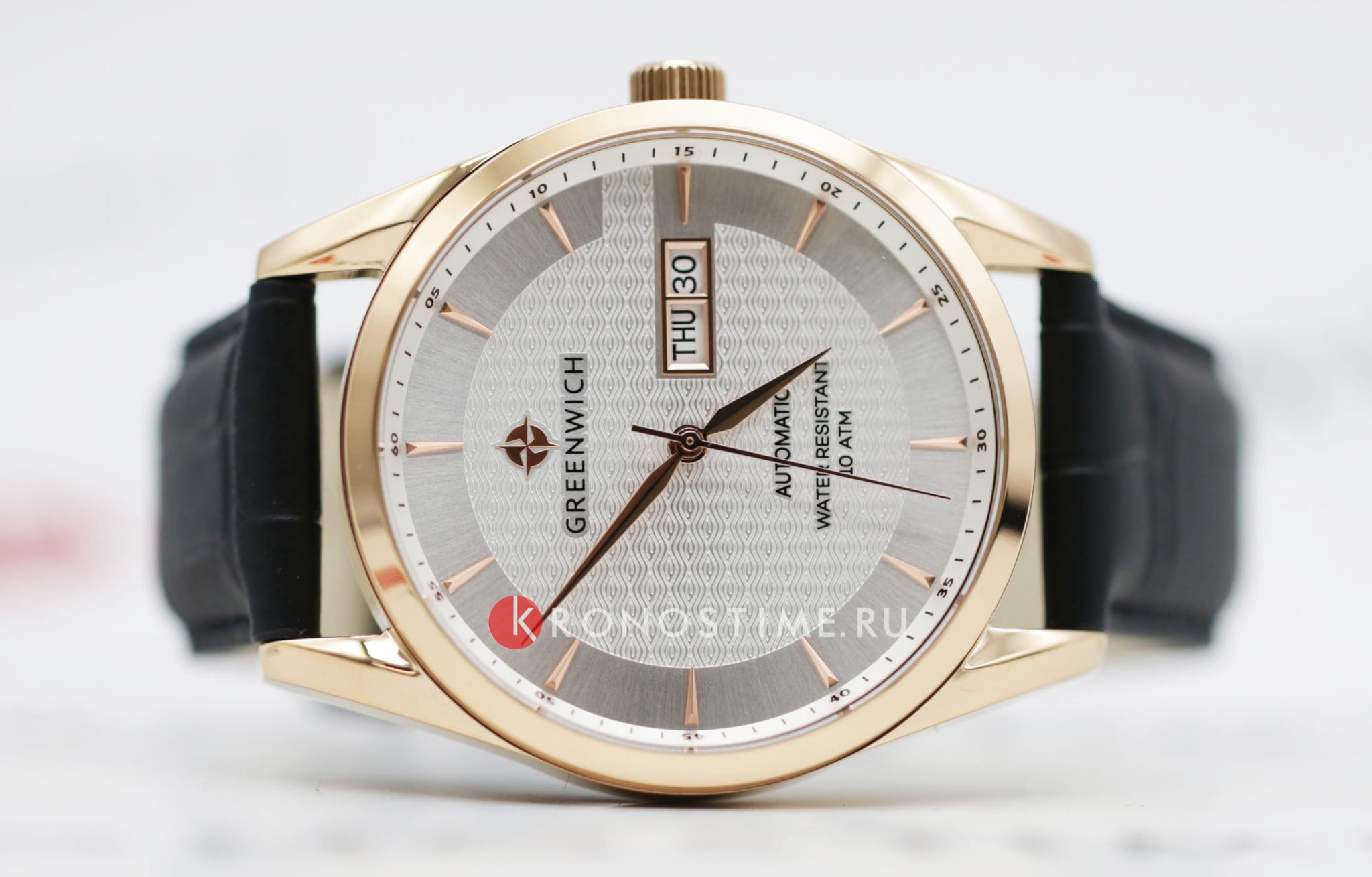 Мужские часы с минеральным стекломМинеральное стеклоМинеральное стекло представляет собой искусственно выращенный минерал кварца. Такое стекло отличается особой устойчивостью к повреждениям и царапинам. Уступает по некоторым качествам сапфировому стеклу. Greenwich Good Luck Classic GW 074.41.33, представляют собой классический вариант для повседневной носки. В центральной части циферблата — отличительная черта моделей этой серии: гильоше, объемные линии которого напоминают волны. Обратите внимание на форму пластины, где крепятся накладные риски: она сделана в форме латинской буквы G, первой буквы в названии бренда. Часы характеризуются традиционными формами, лаконичным исполнением, что делает модель элегантным дополнением к деловому костюму. Сквозь прозрачную заднюю крышку вы увидите детали механизма TMI с декорированным ротором: на нем выгравировано изображение символа английских моряков — парусника. Ремешок на стандартной застёжке выполнен из натуральной кожи с прошивкой в тон. Дизайн, актуальный для любого современного образа, и надежность используемых материалов делают автоматические часы Greenwich удобным и стильным аксессуаром на каждый день. Окошко даты и дня недели находится в положении 3 часа. Класс водозащиты: 100 метров, позволит плавать, нырять и заниматься другими водными видами спорта. Корпус с PVD-покрытиемPVDУльтратонкое покрытие наносится в технике вакуумного напыления, сочетает в себе нитрид титана особой прочности со слоем золота или оксида хрома. Несёт в себе декоративную или защитную функцию..