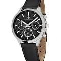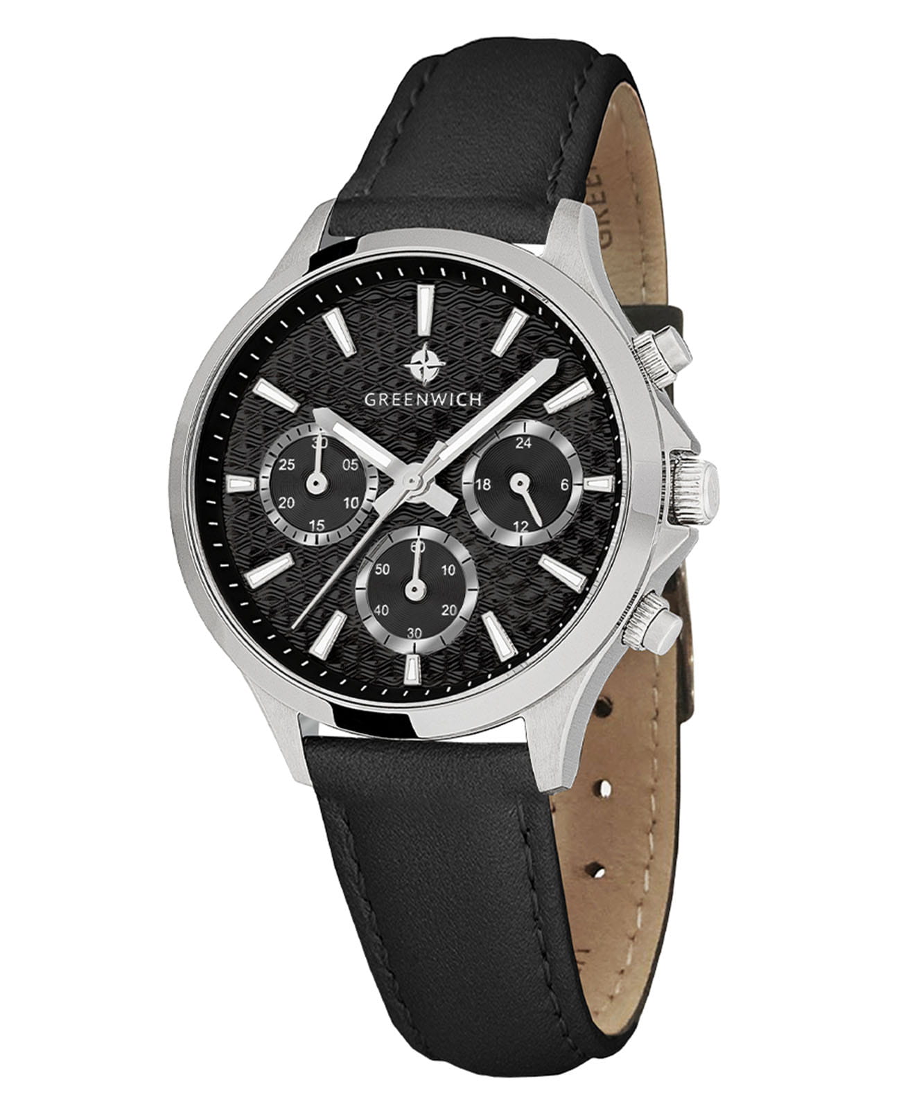 Женские кварцевые часы Greenwich из коллекции Mermaid — это сочетание элегантности и функциональности. Корпус диаметром 35 мм выполнен из нержавеющей стали. Циферблат чёрного цвета оформлен с эффектом гильоше в виде волнообразных линий, придающим ему объём и глубину. На циферблате расположены субциферблаты хронографа (секундомер на 60 секунд и 30 минут) и индикатор 24-часового формата. Все индикаторы выделены рамками с зеркальной полировкой. Стрелки и метки с люминесцентным покрытиемЛюминесцентное покрытиеПозволяет считывать показания времени в темноте. Производители наносят на стрелки, часовые индексы, безель или поверхность циферблата светонакопительный состав, дающий холодное свечение., обеспечивающим хорошую читаемость в темноте. Циферблат защищён минеральным стекломМинеральное стеклоМинеральное стекло представляет собой искусственно выращенный минерал кварца. Такое стекло отличается особой устойчивостью к повреждениям и царапинам. Уступает по некоторым качествам сапфировому стеклу.. Механизм — кварцевый калибр Miyota с функцией хронографа. Часы оснащены кожаным ремешком чёрного цвета с классической пряжкой из нержавеющей стали. Водонепроницаемость 100 м позволяет использовать часы для плавания и повседневного ношения. Гарантия — 24 месяца. Идеальный выбор для тех, кто ценит стиль, точность и надёжность.