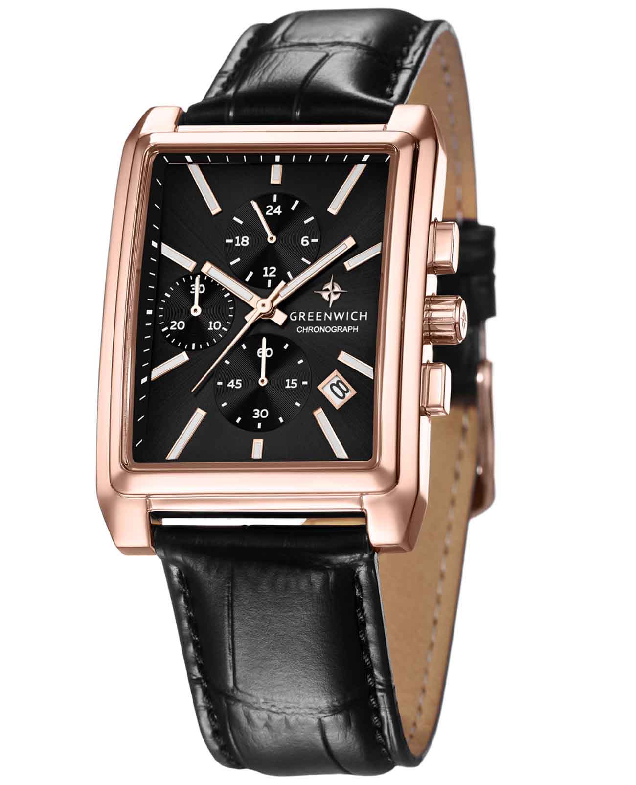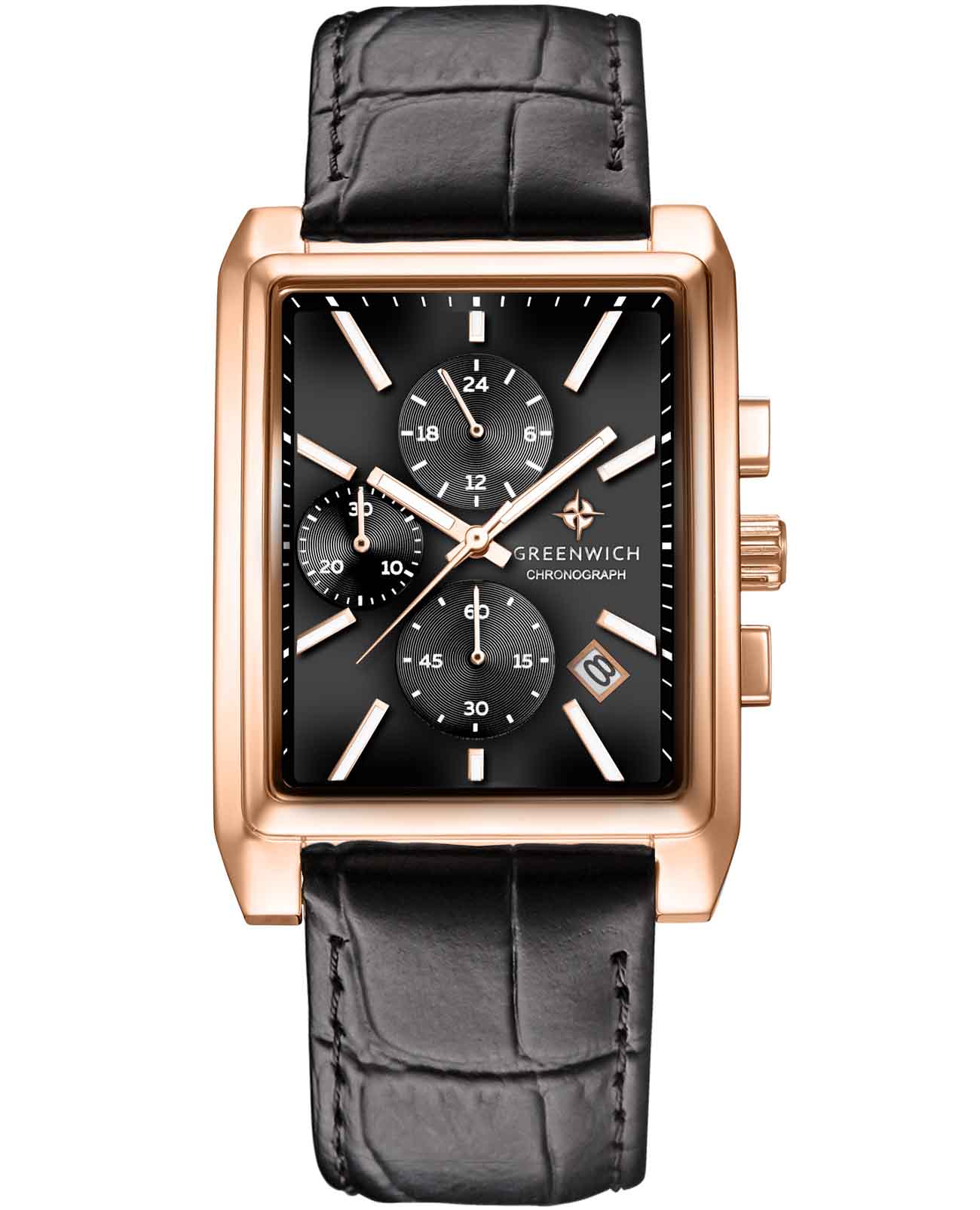 Мужские часы-хронографХронографФункция позволяет измерять отрезки времени с особой точностью: часы, минуты, секунды. Верным признаком хронографа является наличие на циферблате 3 дополнительных окошек-счётчиков. Greenwich Galeon Chrono GW 553.41.11, кварцевый механизм с минеральным стекломМинеральное стеклоМинеральное стекло представляет собой искусственно выращенный минерал кварца. Такое стекло отличается особой устойчивостью к повреждениям и царапинам. Уступает по некоторым качествам сапфировому стеклу.. Корпус из нержавеющей стали с PVD-покрытиемPVDУльтратонкое покрытие наносится в технике вакуумного напыления, сочетает в себе нитрид титана особой прочности со слоем золота или оксида хрома. Несёт в себе декоративную или защитную функцию.. Стрелки и метки с люминесцентным покрытиемЛюминесцентное покрытиеПозволяет считывать показания времени в темноте. Производители наносят на стрелки, часовые индексы, безель или поверхность циферблата светонакопительный состав, дающий холодное свечение.. Окошко даты находится в положении между 4 и 5 часами. Класс водозащиты: 50 метров, позволит защитить корпус от случайных брызг или капель дождя. Кожаный ремешок на стандартной застежке.