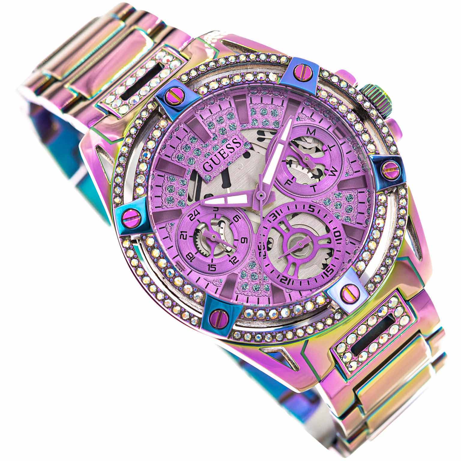Женские наручные часы-скелетоны Guess Queen GW0464L4 с минеральным стекломМинеральное стеклоМинеральное стекло представляет собой искусственно выращенный минерал кварца. Такое стекло отличается особой устойчивостью к повреждениям и царапинам. Уступает по некоторым качествам сапфировому стеклу., кварцевый механизм с высокой точностью. Класс водозащиты: 30 метров, позволит защитить корпус от случайных брызг или капель дождя. Корпус часов изготовлен из стали с IP-покрытиемIP-покрытиеМетод ионного напыления. Демонстрирует повышенную устойчивость к истиранию, окислению и химическим веществам. Под воздействием высокого давления и температуры около 1500°C молекулы металла надёжно соединяются с частицами корпуса часов.. Браслет с раскладной застёжкойРаскладная застёжкаТакой тип застёжки используется только на браслетах из металла. Она никогда не раскрывается полностью, происходит разделение на 2 и более частей. Раскладывающая застёжка снизит вероятность потери часов к минимуму. с IP-покрытиемIP-покрытиеМетод ионного напыления. Демонстрирует повышенную устойчивость к истиранию, окислению и химическим веществам. Под воздействием высокого давления и температуры около 1500°C молекулы металла надёжно соединяются с частицами корпуса часов.. 12-ти и 24-х часовой формат времени, дата и день недели вынесены на отдельные циферблаты. Метки в виде штрихов. Рифленая заводная головка с защитой. Стрелки с люминесцентным покрытиемЛюминесцентное покрытиеПозволяет считывать показания времени в темноте. Производители наносят на стрелки, часовые индексы, безель или поверхность циферблата светонакопительный состав, дающий холодное свечение..