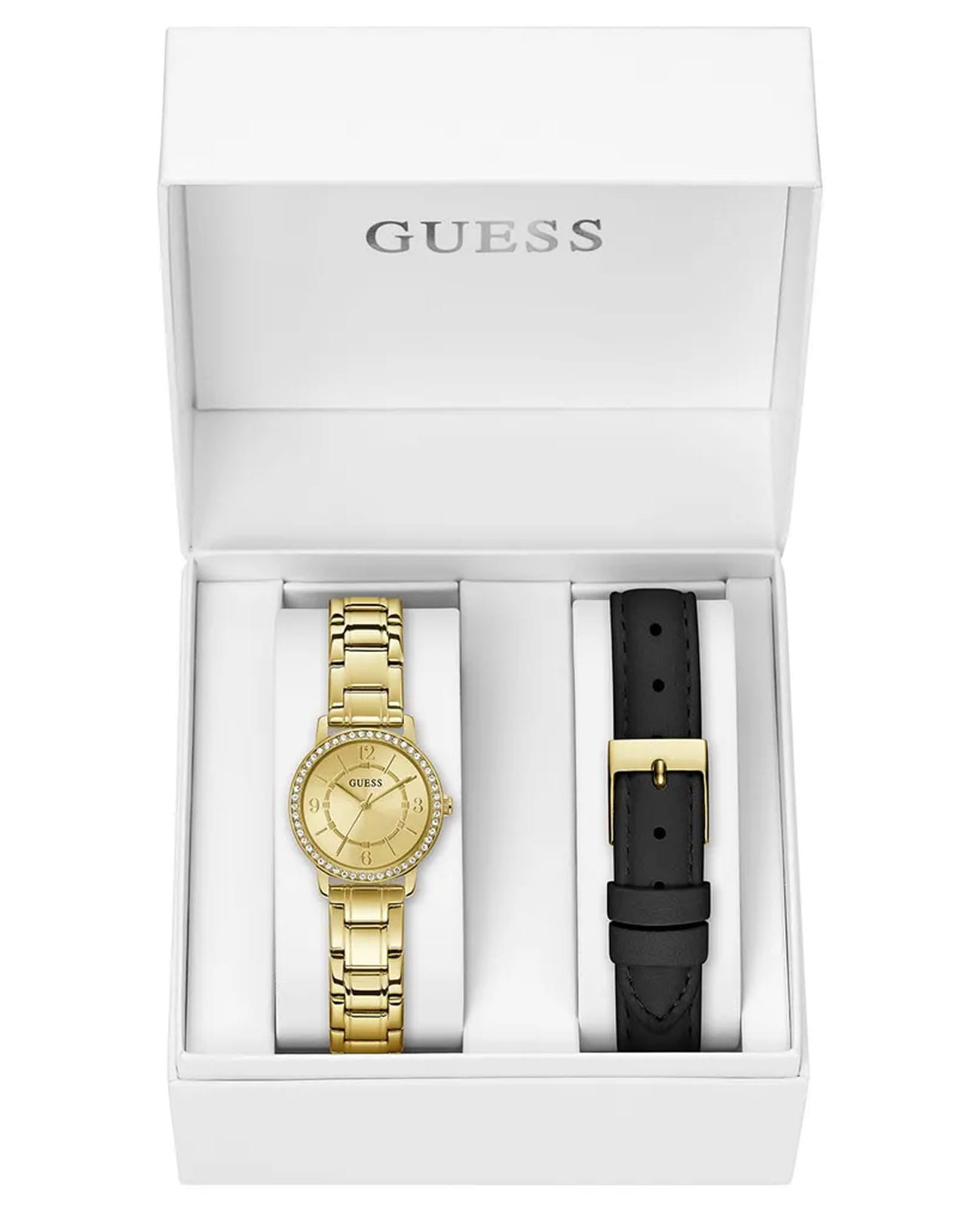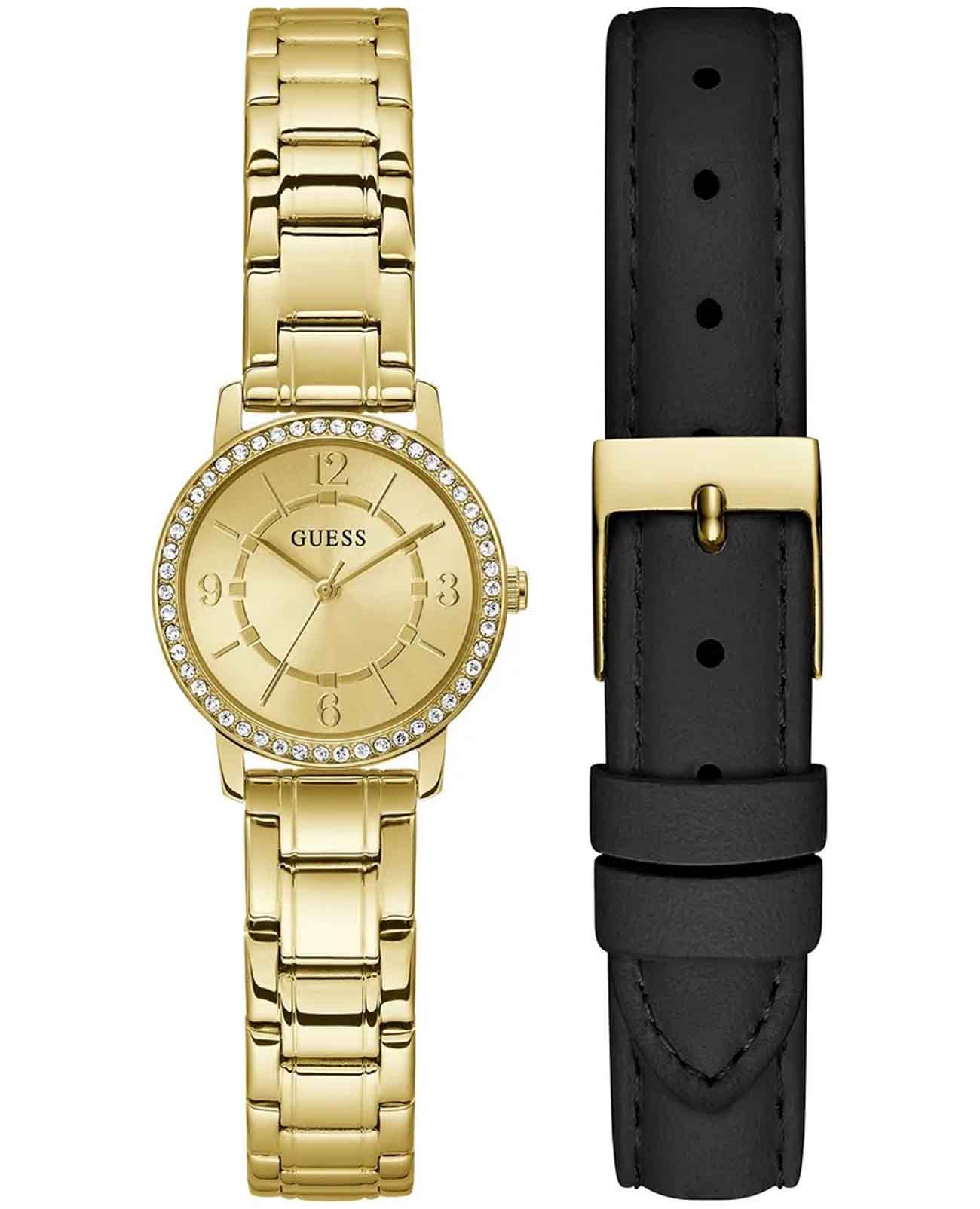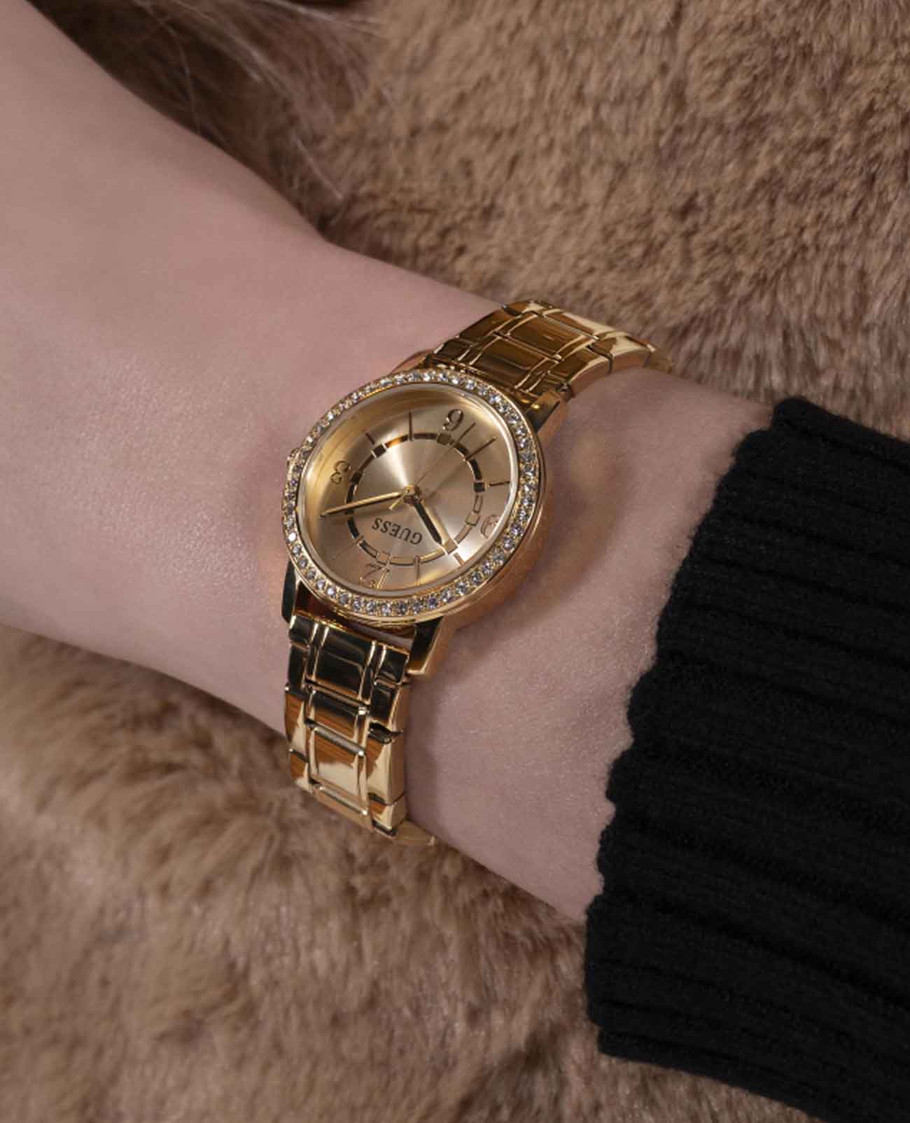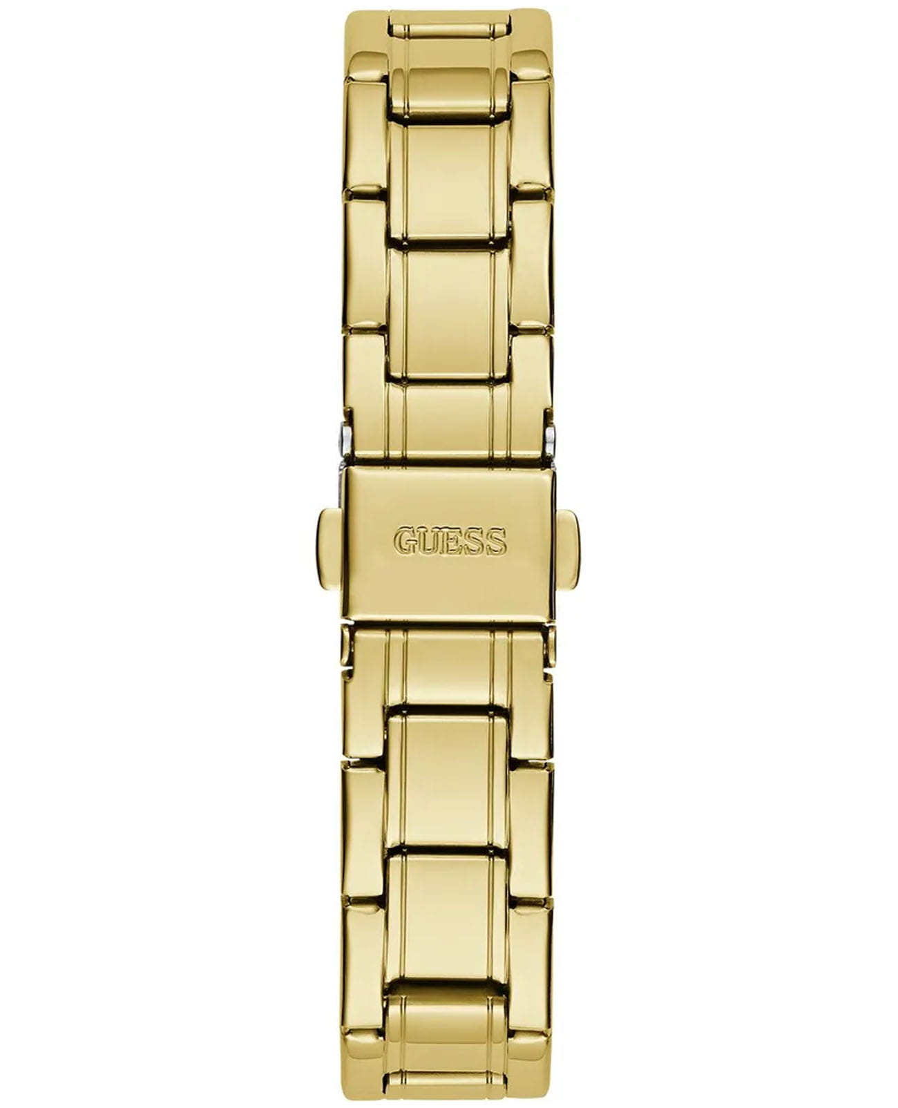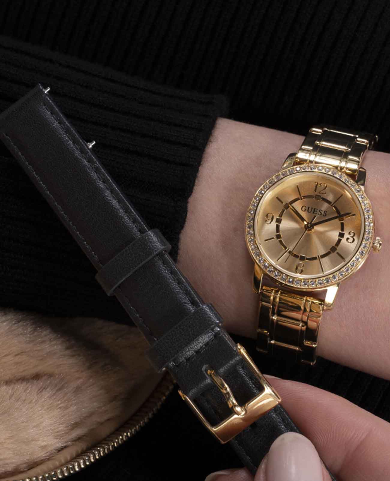 Женские наручные часы Guess Dress GW0808L2 с минеральным стекломМинеральное стеклоМинеральное стекло представляет собой искусственно выращенный минерал кварца. Такое стекло отличается особой устойчивостью к повреждениям и царапинам. Уступает по некоторым качествам сапфировому стеклу., кварцевый механизм с высокой точностью. Корпус часов изготовлен из стали с IP-покрытиемIP-покрытиеМетод ионного напыления. Демонстрирует повышенную устойчивость к истиранию, окислению и химическим веществам. Под воздействием высокого давления и температуры около 1500°C молекулы металла надёжно соединяются с частицами корпуса часов.. БезельБезельВнешний ободок, закрепляющий стекло. В спортивных часах так называется поворотное кольцо с делениями на циферблате, выполняет роль таймера – замеряет отрезки времени на шкале. Неподвижный безель – элемент декора. Однонаправленно вращающийся безель на дайверских часах позволяет фиксировать моменты погружения и выныривания на поверхность. с IP-покрытиемIP-покрытиеМетод ионного напыления. Демонстрирует повышенную устойчивость к истиранию, окислению и химическим веществам. Под воздействием высокого давления и температуры около 1500°C молекулы металла надёжно соединяются с частицами корпуса часов. украшен кристаллами. Класс водозащиты: 50 метров, позволит защитить корпус от случайных брызг или капель дождя. Стальной браслет с IP-покрытиемIP-покрытиеМетод ионного напыления. Демонстрирует повышенную устойчивость к истиранию, окислению и химическим веществам. Под воздействием высокого давления и температуры около 1500°C молекулы металла надёжно соединяются с частицами корпуса часов. на раскладной застёжкеРаскладная застёжкаТакой тип застёжки используется только на браслетах из металла. Она никогда не раскрывается полностью, происходит разделение на 2 и более частей. Раскладывающая застёжка снизит вероятность потери часов к минимуму.. Кожаный ремешок в комплекте.