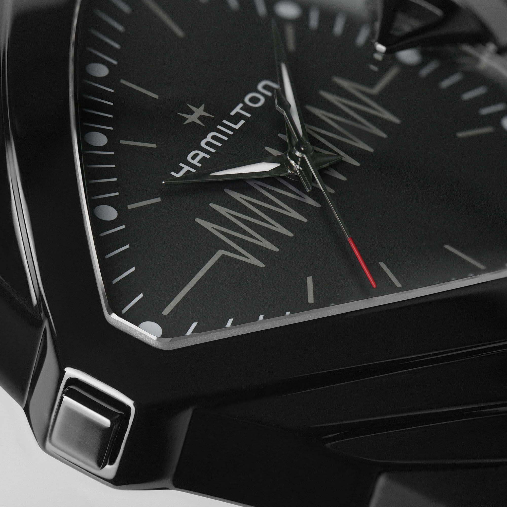 Hamilton Ventura XXL Bright – культовая модель, сочетающая в себе смелый футуристический дизайн и передовые технологии. Корпус из нержавеющей стали с PVDPVDУльтратонкое покрытие наносится в технике вакуумного напыления, сочетает в себе нитрид титана особой прочности со слоем золота или оксида хрома. Несёт в себе декоративную или защитную функцию.-покрытием придаёт глубокий чёрный оттенок и дополнительную защиту от царапин, а сапфировое стеклоСапфировое стеклоПрочный и надёжный материал из кристалла сапфира синтетического происхождения, характеризующийся особой твёрдостью и устойчивостью к царапинам и повреждениям. гарантирует безупречную читаемость циферблата. Надёжный механизм обеспечивает точность хода, а чёрный каучуковый ремешок добавляет удобства в повседневном ношении. Люминесцентное покрытиеЛюминесцентное покрытиеПозволяет считывать показания времени в темноте. Производители наносят на стрелки, часовые индексы, безель или поверхность циферблата светонакопительный состав, дающий холодное свечение. на стрелках и маркерах позволяет считывать время даже в полной темноте. Водонепроницаемость до 50 метров защищает часы от брызг и дождя, делая их отличным выбором для активного образа жизни.