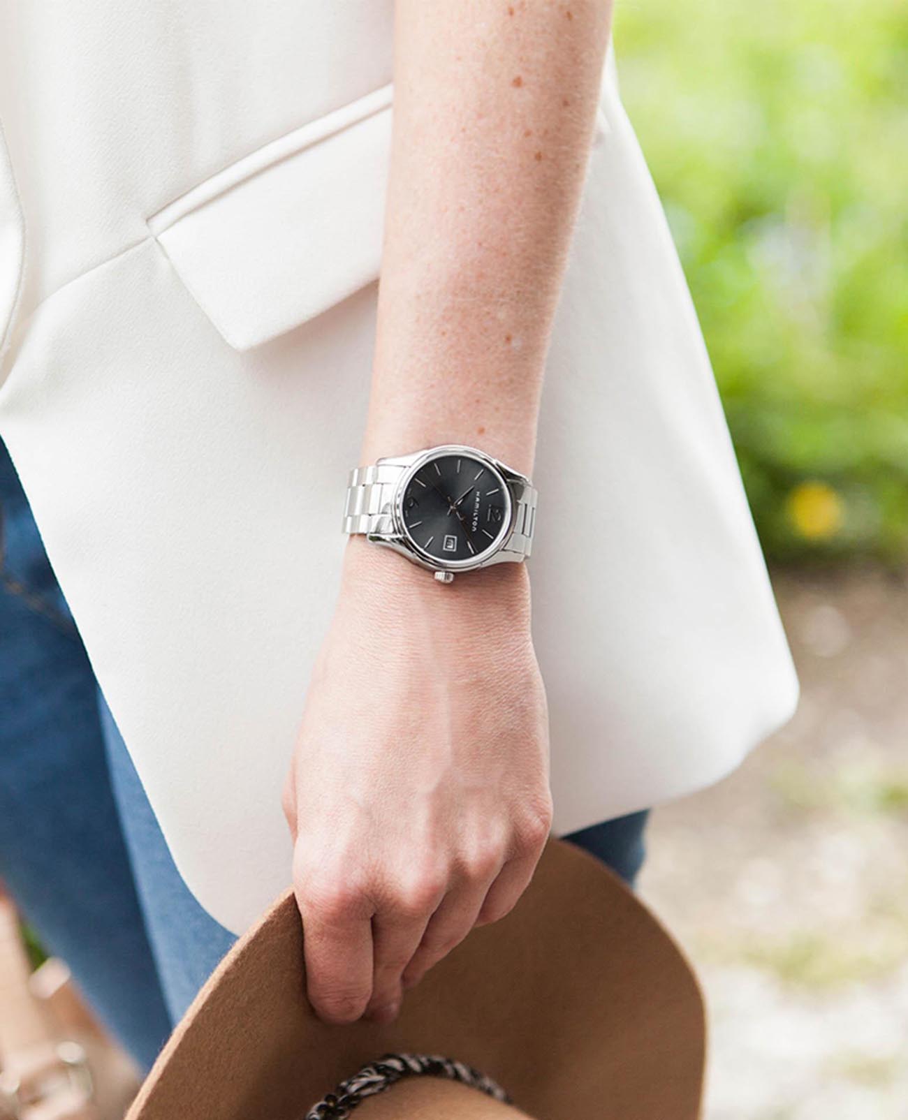 Швейцарские женские часы Hamilton Jazzmaster Lady Quartz H32351135 с надёжным кварцевым механизмом. Корпус часов изготовлен из нержавеющей стали. Стальной браслет на застёжке-бабочке с кнопкамиЗастёжка "бабочка"Такой вид застёжки дополняется предохранителями, помогающими избежать случайного раскрытия браслета. Обладают изящным исполнением. . Сапфировое стеклоСапфировое стеклоПрочный и надёжный материал из кристалла сапфира синтетического происхождения, характеризующийся особой твёрдостью и устойчивостью к царапинам и повреждениям. с антибликовым покрытием. Стрелки и метки с люминесцентным покрытиемЛюминесцентное покрытиеПозволяет считывать показания времени в темноте. Производители наносят на стрелки, часовые индексы, безель или поверхность циферблата светонакопительный состав, дающий холодное свечение.. Окошко даты находится в положении 3 часа.