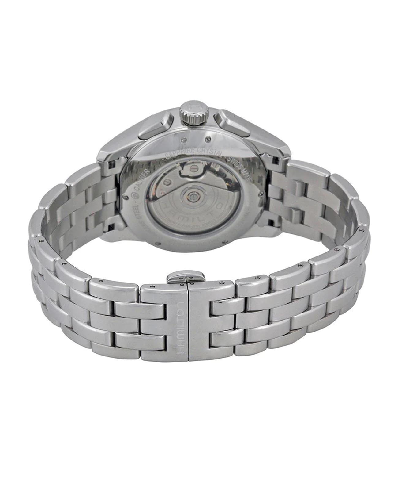 Часы-хронографХронографФункция позволяет измерять отрезки времени с особой точностью: часы, минуты, секунды. Верным признаком хронографа является наличие на циферблате 3 дополнительных окошек-счётчиков. Hamilton Jazzmaster Auto Chrono H32596151 с автоматическим механизмом высокой точности. Сапфировое стеклоСапфировое стеклоПрочный и надёжный материал из кристалла сапфира синтетического происхождения, характеризующийся особой твёрдостью и устойчивостью к царапинам и повреждениям. устойчивое к появлению царапин, обладающее высокой прозрачностью. Класс водозащиты: 100 метров, позволит плавать, нырять и заниматься другими водными видами спорта. Корпус и браслет часов изготовлены из нержавеющей стали. Стальной браслет на застёжке-бабочке с кнопкамиЗастёжка "бабочка"Такой вид застёжки дополняется предохранителями, помогающими избежать случайного раскрытия браслета. Обладают изящным исполнением. . Стрелки и метки с люминесцентным покрытиемЛюминесцентное покрытиеПозволяет считывать показания времени в темноте. Производители наносят на стрелки, часовые индексы, безель или поверхность циферблата светонакопительный состав, дающий холодное свечение.. Окошко даты находится в положении 4 часа.