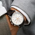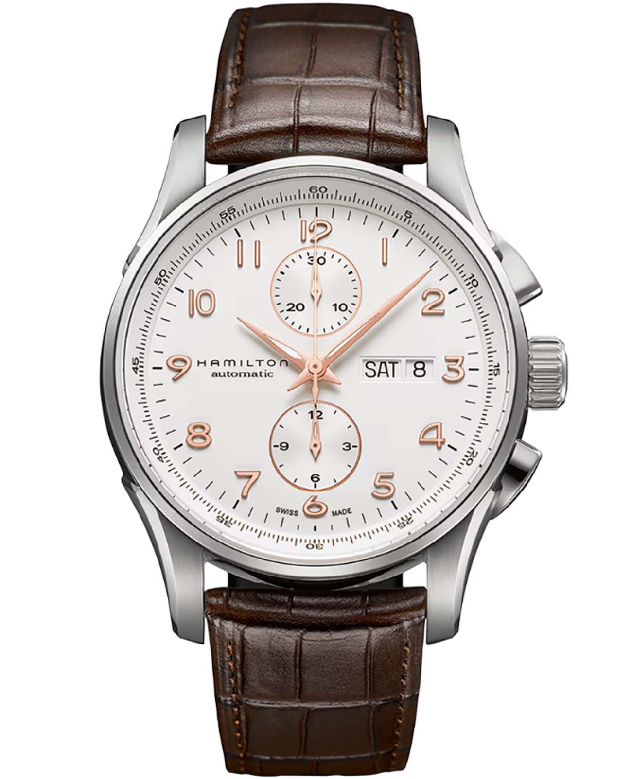 Мужские наручные часы-хронографХронографФункция позволяет измерять отрезки времени с особой точностью: часы, минуты, секунды. Верным признаком хронографа является наличие на циферблате 3 дополнительных окошек-счётчиков. Hamilton Jazzmaster Maestro Auto Chrono H32766513 с автоматическим механизмом. Корпус выполнен из нержавеющей стали. Сапфировое стеклоСапфировое стеклоПрочный и надёжный материал из кристалла сапфира синтетического происхождения, характеризующийся особой твёрдостью и устойчивостью к царапинам и повреждениям. устойчивое к мелким механическим повреждениям. Кожаный ремешок на стандартной застёжке. Стрелки и метки с люминесцентным покрытиемЛюминесцентное покрытиеПозволяет считывать показания времени в темноте. Производители наносят на стрелки, часовые индексы, безель или поверхность циферблата светонакопительный состав, дающий холодное свечение.. Окошки дня недели и даты находятся в положении 3 часа. Класс водозащиты: 100 метров, позволит плавать, нырять и заниматься другими водными видами спорта.