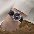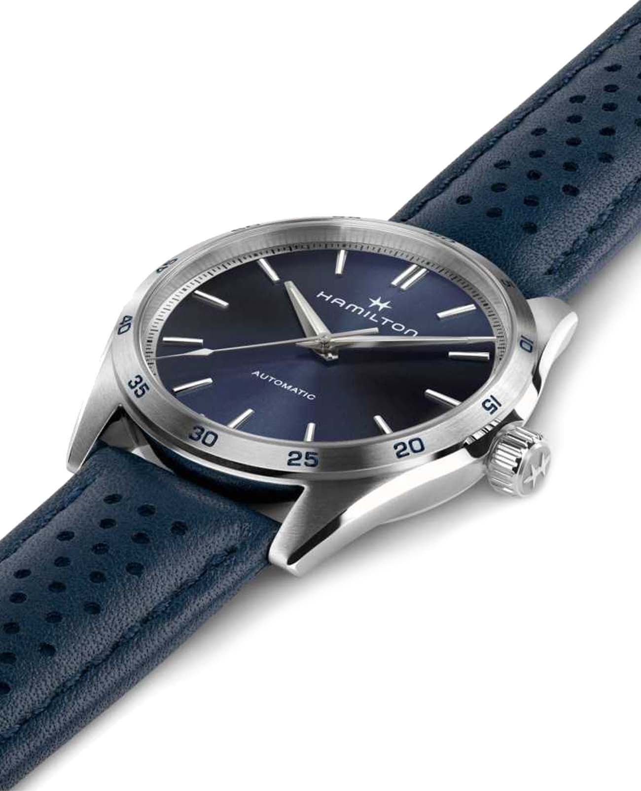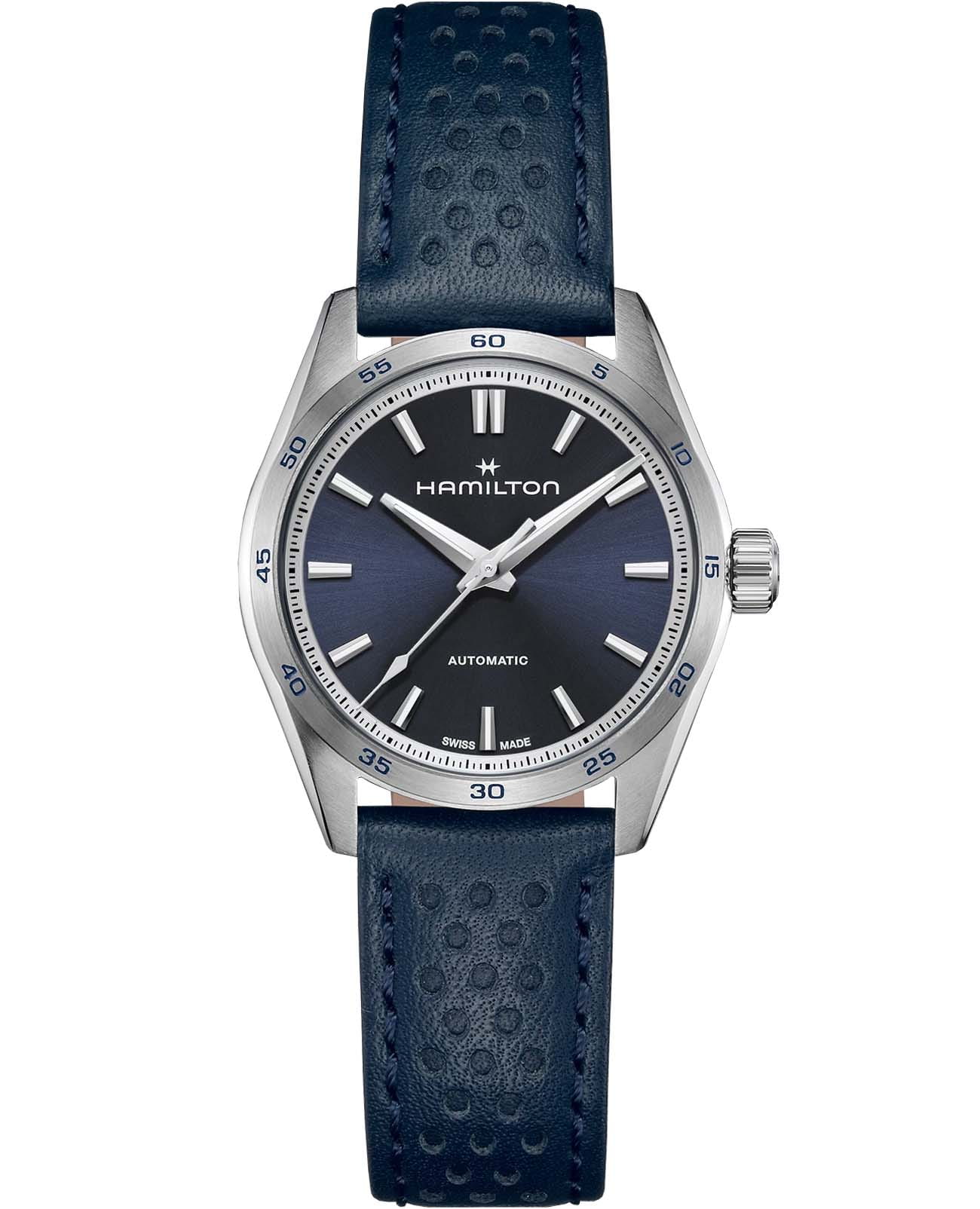 Модели из линии Jazzmaster Performer, привлекающие внимание ярким дизайном в стиле спортивный шик, сочетают в себе функциональность и эстетичность. Часы Jazzmaster Performer Automatic оснащены автоматическим механизмом H-10 с 80-часовым запасом хода. Модель в корпусе из нержавеющей стали диаметром 34 мм имеет лаконичный синий циферблат из нержавеющей стали и сочетающийся с ним перфорированный синий кожаный ремешок в гоночном стиле. Сапфировое стеклоСапфировое стеклоПрочный и надёжный материал из кристалла сапфира синтетического происхождения, характеризующийся особой твёрдостью и устойчивостью к царапинам и повреждениям. с антибликовым покрытием. Кожаный ремешок на стандартной застёжке. Стрелки и метки с люминесцентным покрытиемЛюминесцентное покрытиеПозволяет считывать показания времени в темноте. Производители наносят на стрелки, часовые индексы, безель или поверхность циферблата светонакопительный состав, дающий холодное свечение..