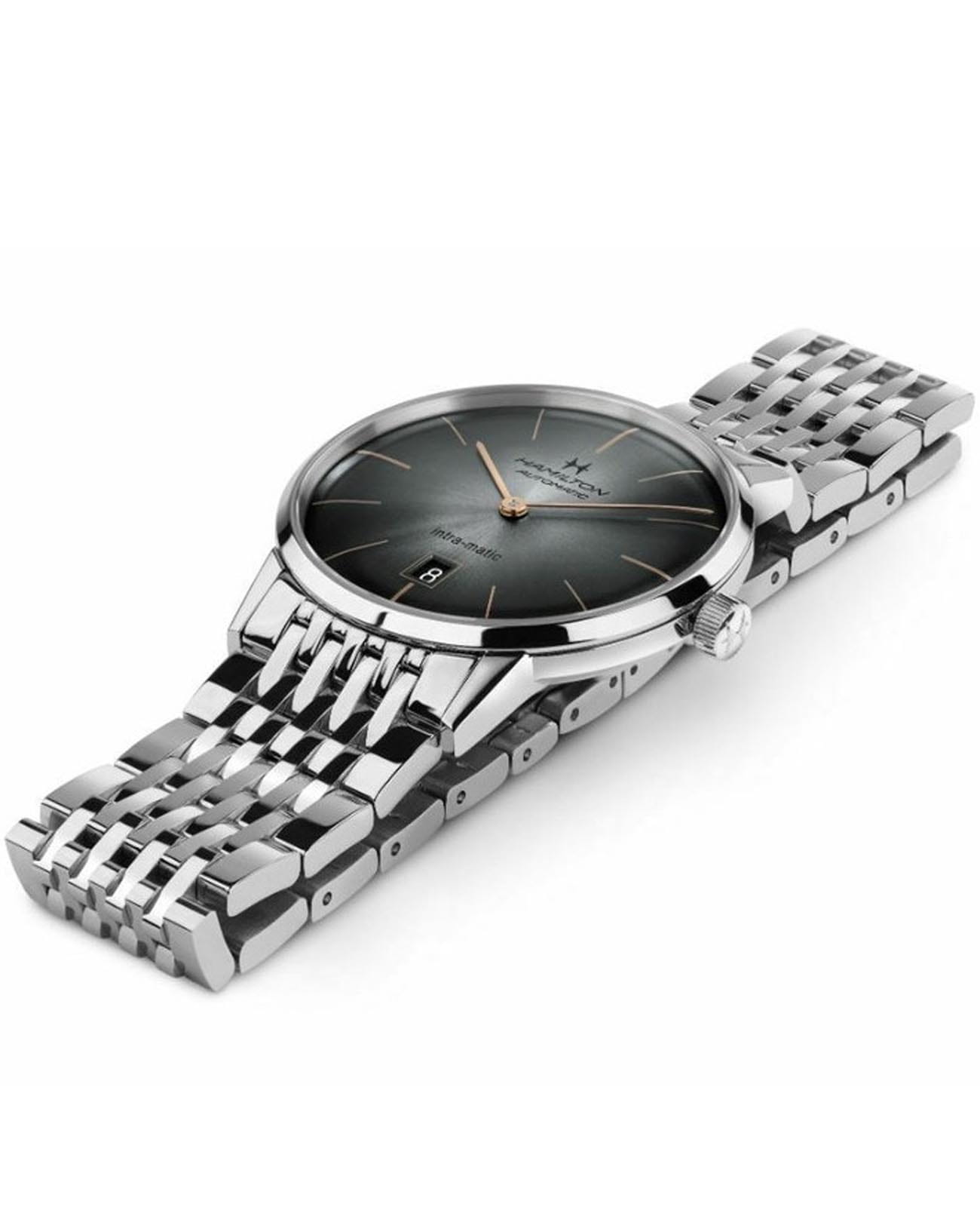 Мужские наручные часы Hamilton American Classic Intra-Matic Auto H38455181 с надёжным автоматическим механизмом. Корпус часов изготовлен из нержавеющей стали. Стальной браслет на застёжке-бабочке с кнопкамиЗастёжка "бабочка"Такой вид застёжки дополняется предохранителями, помогающими избежать случайного раскрытия браслета. Обладают изящным исполнением. . Сапфировое стеклоСапфировое стеклоПрочный и надёжный материал из кристалла сапфира синтетического происхождения, характеризующийся особой твёрдостью и устойчивостью к царапинам и повреждениям. с антибликовым покрытием. Окошко даты находится в положении 6 часов. Класс водозащиты: 50 метров, позволит защитить корпус от случайных брызг или капель дождя.