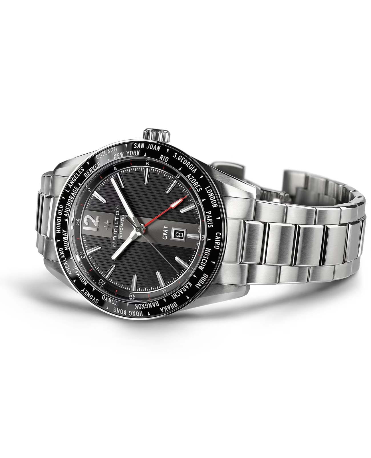 Мужские механические швейцарские часы Hamilton Broadway GMTGMTОтображение времени второго часового пояса.Такая функция особенно актуальна для путешественников и бизнесменов,которые общаются с людьми из разных стран,теперь вы всегда будете знать,какой час у вашего партнёра или близкого человека. Limited Edition H43725131. Сапфировое стеклоСапфировое стеклоПрочный и надёжный материал из кристалла сапфира синтетического происхождения, характеризующийся особой твёрдостью и устойчивостью к царапинам и повреждениям. устойчивое к появлению царапин, обладающее высокой прозрачностью. Класс водозащиты: 50 метров, позволит защитить корпус от случайных брызг или капель дождя. Корпус часов изготовлен из стали. Стрелки и метки с люминесцентным покрытиемЛюминесцентное покрытиеПозволяет считывать показания времени в темноте. Производители наносят на стрелки, часовые индексы, безель или поверхность циферблата светонакопительный состав, дающий холодное свечение.. Стальной браслет на раскладной застёжкеРаскладная застёжкаТакой тип застёжки используется только на браслетах из металла. Она никогда не раскрывается полностью, происходит разделение на 2 и более частей. Раскладывающая застёжка снизит вероятность потери часов к минимуму.. Окошко даты находится в положении 6 часов. БезельБезельВнешний ободок, закрепляющий стекло. В спортивных часах так называется поворотное кольцо с делениями на циферблате, выполняет роль таймера – замеряет отрезки времени на шкале. Неподвижный безель – элемент декора. Однонаправленно вращающийся безель на дайверских часах позволяет фиксировать моменты погружения и выныривания на поверхность. с PVD-покрытиемPVDУльтратонкое покрытие наносится в технике вакуумного напыления, сочетает в себе нитрид титана особой прочности со слоем золота или оксида хрома. Несёт в себе декоративную или защитную функцию..