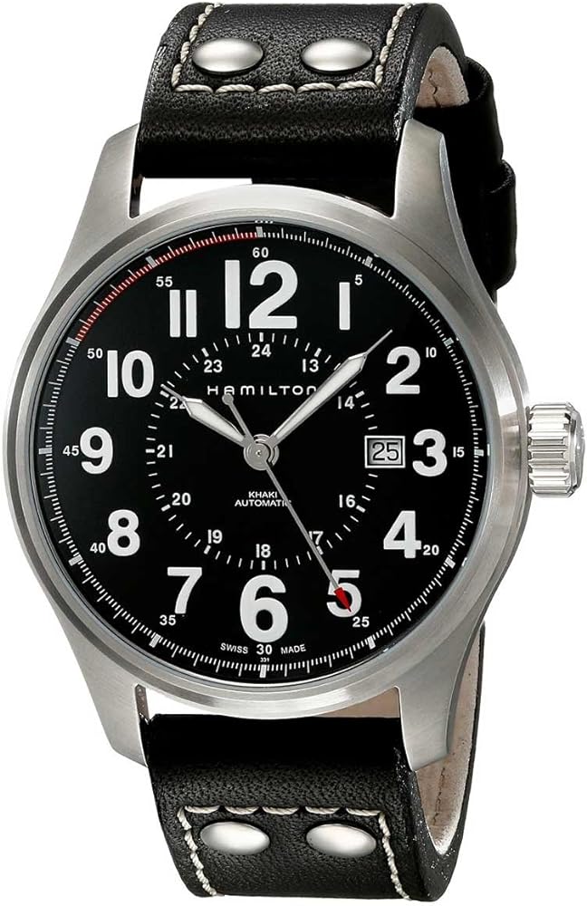 Мужские швейцарские часы Hamilton Khaki Field Auto H70615733, механический механизм (автоматический калибр) с высокой точностью. Сапфировое стеклоСапфировое стеклоПрочный и надёжный материал из кристалла сапфира синтетического происхождения, характеризующийся особой твёрдостью и устойчивостью к царапинам и повреждениям., устойчивое к появлению царапин, обладающее высокой прозрачностью. Класс водозащиты: 100 метров, позволит плавать, нырять и заниматься другими водными видами спорта. Корпус часов изготовлен из нержавеющей стали. Окошко даты находится в положении 3 часа. Кожаный ремешок на стандартной застёжке. Стрелки и метки с люминесцентным покрытиемЛюминесцентное покрытиеПозволяет считывать показания времени в темноте. Производители наносят на стрелки, часовые индексы, безель или поверхность циферблата светонакопительный состав, дающий холодное свечение..