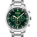 Мужские часы Hugo Boss Pioneer HB1513868 представлены в круглом 44-мм корпусе из нержавеющей стали. Оснащены кварцевым механизмом с функциями хронографаХронографФункция позволяет измерять отрезки времени с особой точностью: часы, минуты, секунды. Верным признаком хронографа является наличие на циферблате 3 дополнительных окошек-счётчиков. и секундомеромСекундомерСекундоме́р — прибор, способный измерять интервалы времени с точностью до долей секунды., а также индикацией даты. Зеленый циферблат с метками в виде штрихов защищен устойчивым к царапинам минеральным стекломМинеральное стеклоМинеральное стекло представляет собой искусственно выращенный минерал кварца. Такое стекло отличается особой устойчивостью к повреждениям и царапинам. Уступает по некоторым качествам сапфировому стеклу.. Браслет из стали дополнен раскладной застёжкойРаскладная застёжкаТакой тип застёжки используется только на браслетах из металла. Она никогда не раскрывается полностью, происходит разделение на 2 и более частей. Раскладывающая застёжка снизит вероятность потери часов к минимуму.. Водонепроницаемость 50 метров (5 ATM) обеспечивает защиту от брызг и дождя.