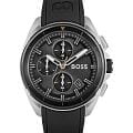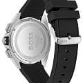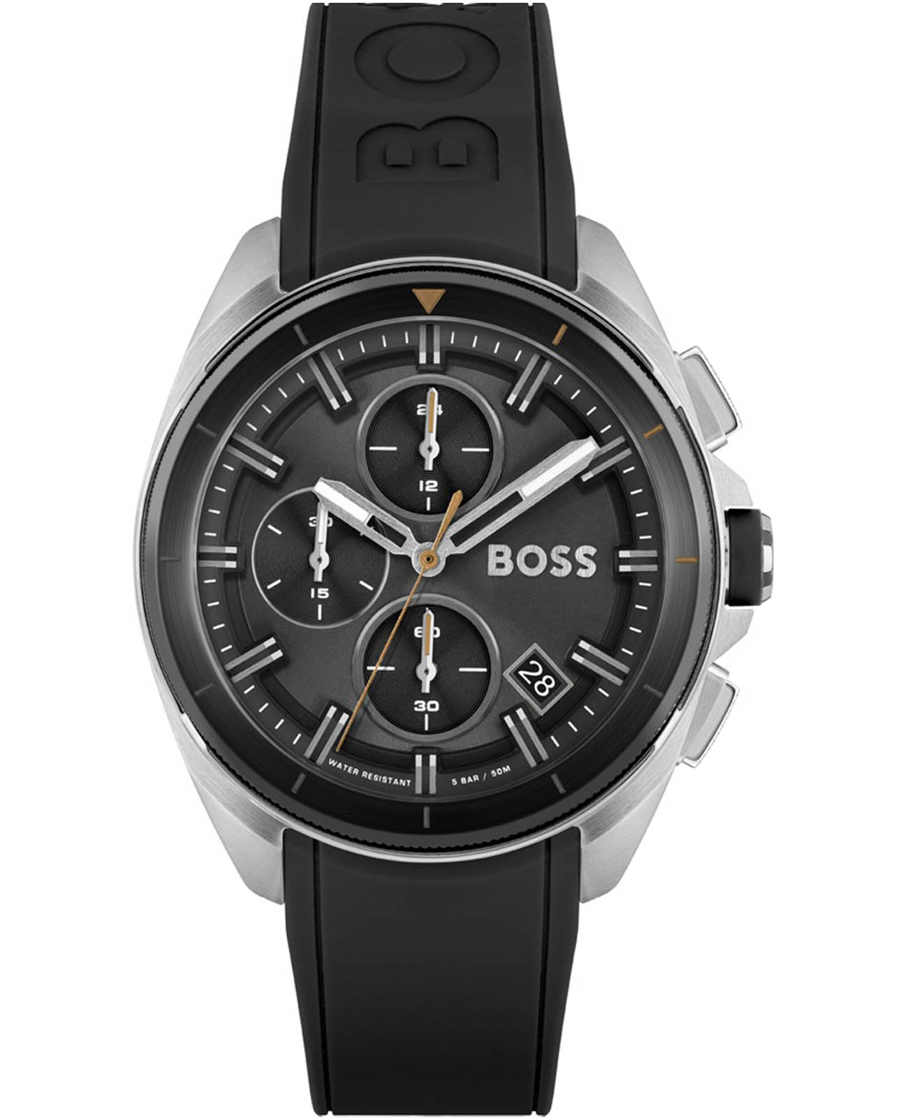 Мужские часы Hugo Boss Volane HB1513953 представлены в круглом 44-мм корпусе из нержавеющей стали с IP-покрытиемIP-покрытиеМетод ионного напыления. Демонстрирует повышенную устойчивость к истиранию, окислению и химическим веществам. Под воздействием высокого давления и температуры около 1500°C молекулы металла надёжно соединяются с частицами корпуса часов.. Оснащены кварцевым механизмом с функциями хронографаХронографФункция позволяет измерять отрезки времени с особой точностью: часы, минуты, секунды. Верным признаком хронографа является наличие на циферблате 3 дополнительных окошек-счётчиков. и секундомеромСекундомерСекундоме́р — прибор, способный измерять интервалы времени с точностью до долей секунды.. Черный циферблат защищен устойчивым к царапинам минеральным стекломМинеральное стеклоМинеральное стекло представляет собой искусственно выращенный минерал кварца. Такое стекло отличается особой устойчивостью к повреждениям и царапинам. Уступает по некоторым качествам сапфировому стеклу.. Силиконовый ремешок черного цвета дополнен стандартной застежкой, а стрелки покрыты люминесцентным составомЛюминесцентное покрытиеПозволяет считывать показания времени в темноте. Производители наносят на стрелки, часовые индексы, безель или поверхность циферблата светонакопительный состав, дающий холодное свечение. для видимости в темноте. Водонепроницаемость 50 метров (5 ATM) позволяет использовать часы для плавания.