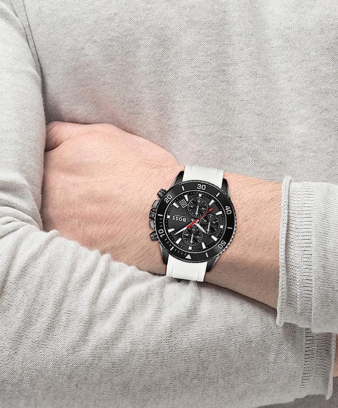 Мужские часы Hugo Boss Admiral HB1513966 представлены в круглом 46-мм корпусе из нержавеющей стали с IP-покрытиемIP-покрытиеМетод ионного напыления. Демонстрирует повышенную устойчивость к истиранию, окислению и химическим веществам. Под воздействием высокого давления и температуры около 1500°C молекулы металла надёжно соединяются с частицами корпуса часов.. Оснащены кварцевым механизмом с функциями хронографаХронографФункция позволяет измерять отрезки времени с особой точностью: часы, минуты, секунды. Верным признаком хронографа является наличие на циферблате 3 дополнительных окошек-счётчиков. и секундомеромСекундомерСекундоме́р — прибор, способный измерять интервалы времени с точностью до долей секунды. на безелеБезельВнешний ободок, закрепляющий стекло. В спортивных часах так называется поворотное кольцо с делениями на циферблате, выполняет роль таймера – замеряет отрезки времени на шкале. Неподвижный безель – элемент декора. Однонаправленно вращающийся безель на дайверских часах позволяет фиксировать моменты погружения и выныривания на поверхность.. Черный циферблат защищен устойчивым к царапинам минеральным стекломМинеральное стеклоМинеральное стекло представляет собой искусственно выращенный минерал кварца. Такое стекло отличается особой устойчивостью к повреждениям и царапинам. Уступает по некоторым качествам сапфировому стеклу.. Силиконовый ремешок белого цвета дополнен стандартной застежкой, а стрелки покрыты люминесцентным составомЛюминесцентное покрытиеПозволяет считывать показания времени в темноте. Производители наносят на стрелки, часовые индексы, безель или поверхность циферблата светонакопительный состав, дающий холодное свечение. для видимости в темноте. Водонепроницаемость 100 метров (10 ATM) позволяет использовать часы для плавания.