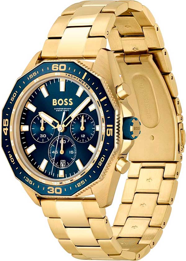 Мужские часы Hugo Boss Energy HB1513973 представлены в круглом 44-мм корпусе из нержавеющей стали с IP-покрытиемIP-покрытиеМетод ионного напыления. Демонстрирует повышенную устойчивость к истиранию, окислению и химическим веществам. Под воздействием высокого давления и температуры около 1500°C молекулы металла надёжно соединяются с частицами корпуса часов.. Оснащены кварцевым механизмом с функциями хронографаХронографФункция позволяет измерять отрезки времени с особой точностью: часы, минуты, секунды. Верным признаком хронографа является наличие на циферблате 3 дополнительных окошек-счётчиков., секундомеромСекундомерСекундоме́р — прибор, способный измерять интервалы времени с точностью до долей секунды. и тахиметромТахиметрРазмеченная шкала, располагается на ободке или безеле часов. Тахиметр позволяет рассчитать скорость на определённом участке пути, расстояние измеряется в километрах или милях. на безелеБезельВнешний ободок, закрепляющий стекло. В спортивных часах так называется поворотное кольцо с делениями на циферблате, выполняет роль таймера – замеряет отрезки времени на шкале. Неподвижный безель – элемент декора. Однонаправленно вращающийся безель на дайверских часах позволяет фиксировать моменты погружения и выныривания на поверхность.. Синий циферблат защищен устойчивым к царапинам минеральным стекломМинеральное стеклоМинеральное стекло представляет собой искусственно выращенный минерал кварца. Такое стекло отличается особой устойчивостью к повреждениям и царапинам. Уступает по некоторым качествам сапфировому стеклу.. Браслет из нержавеющей стали с IP-покрытиемIP-покрытиеМетод ионного напыления. Демонстрирует повышенную устойчивость к истиранию, окислению и химическим веществам. Под воздействием высокого давления и температуры около 1500°C молекулы металла надёжно соединяются с частицами корпуса часов. дополнен раскладной застёжкойРаскладная застёжкаТакой тип застёжки используется только на браслетах из металла. Она никогда не раскрывается полностью, происходит разделение на 2 и более частей. Раскладывающая застёжка снизит вероятность потери часов к минимуму., а стрелки покрыты люминесцентным составомЛюминесцентное покрытиеПозволяет считывать показания времени в темноте. Производители наносят на стрелки, часовые индексы, безель или поверхность циферблата светонакопительный состав, дающий холодное свечение. для видимости в темноте. Водонепроницаемость 50 метров (5 ATM) позволяет использовать часы для плавания.