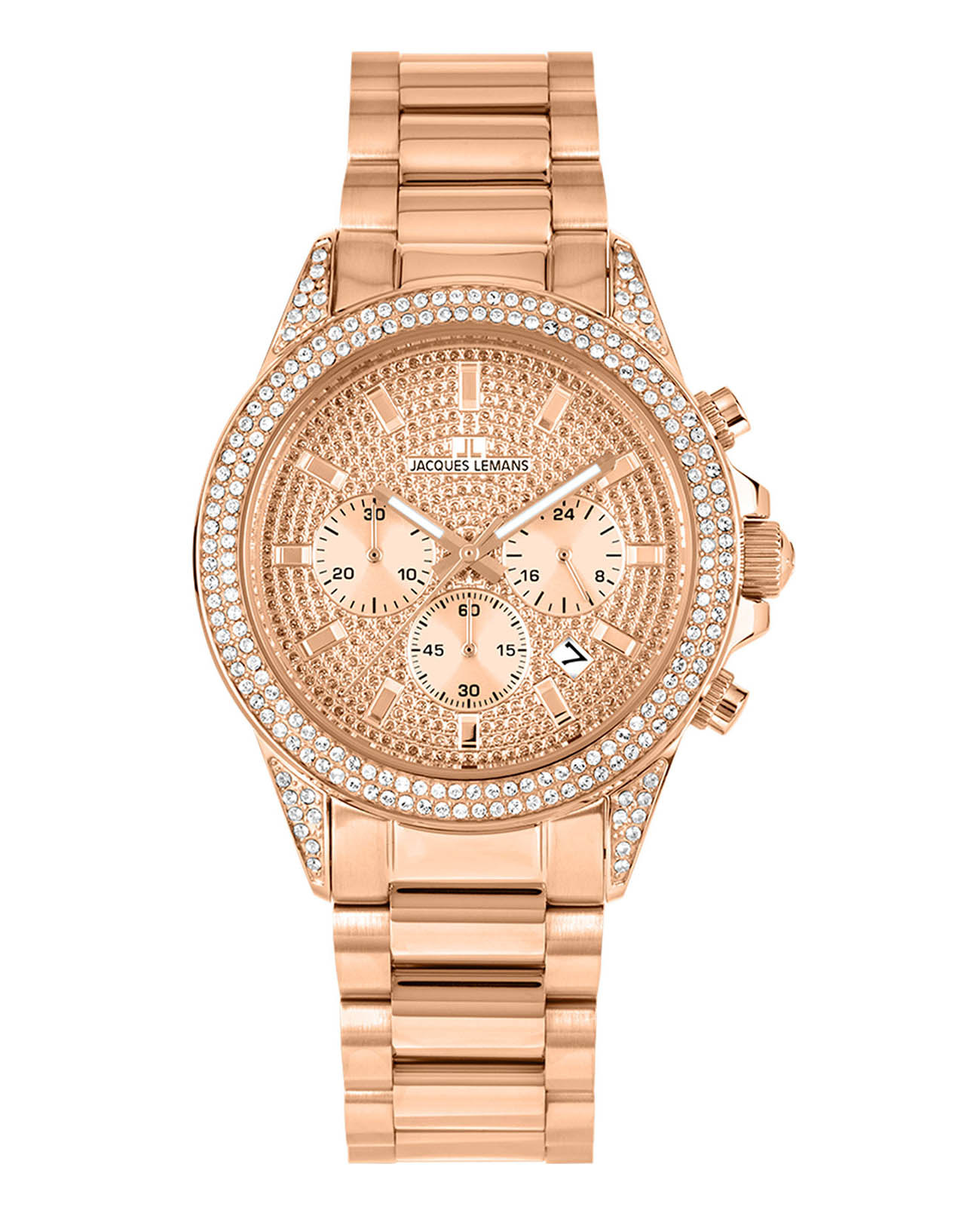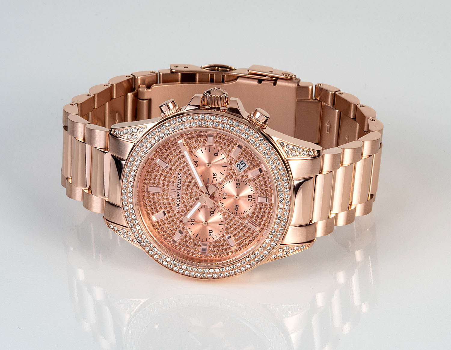 Женские австрийские часы с хронографом Jacques Lemans Design Collection 1-2051B, кварцевый механизм с высокой точностью. Класс водозащиты: 100 метров, позволит плавать, нырять и заниматься другими водными видами спорта. Корпус часов изготовлен из стали, золотистого цвета.