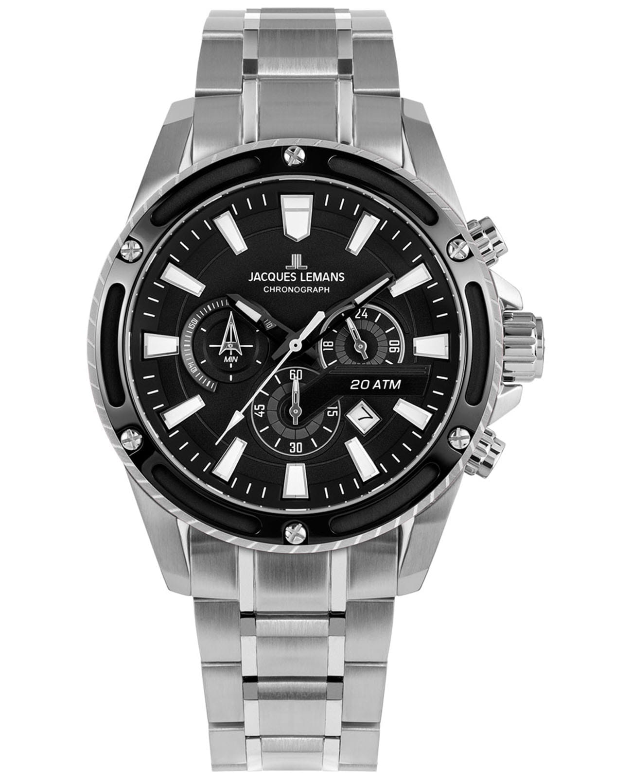 Мужские часы Jacques Lemans Liverpool 1-2141E с минеральным стекломМинеральное стеклоМинеральное стекло представляет собой искусственно выращенный минерал кварца. Такое стекло отличается особой устойчивостью к повреждениям и царапинам. Уступает по некоторым качествам сапфировому стеклу., кварцевый механизм с высокой точностью. Часы- хронографХронографФункция позволяет измерять отрезки времени с особой точностью: часы, минуты, секунды. Верным признаком хронографа является наличие на циферблате 3 дополнительных окошек-счётчиков. с секундомеромСекундомерСекундоме́р — прибор, способный измерять интервалы времени с точностью до долей секунды. представляют собой стильный аксессуар, отражающий идеальное сочетание современного дизайна, надёжности и функциональности. БезельБезельВнешний ободок, закрепляющий стекло. В спортивных часах так называется поворотное кольцо с делениями на циферблате, выполняет роль таймера – замеряет отрезки времени на шкале. Неподвижный безель – элемент декора. Однонаправленно вращающийся безель на дайверских часах позволяет фиксировать моменты погружения и выныривания на поверхность. из нержавеющей стали с PVDPVDУльтратонкое покрытие наносится в технике вакуумного напыления, сочетает в себе нитрид титана особой прочности со слоем золота или оксида хрома. Несёт в себе декоративную или защитную функцию. покрытием и с декоративными прорезями крепится к корпусу шестью винтами. На циферблате расположены три дополнительных индикатора и окошко даты. Стрелки и метки с люминесцентным покрытиемЛюминесцентное покрытиеПозволяет считывать показания времени в темноте. Производители наносят на стрелки, часовые индексы, безель или поверхность циферблата светонакопительный состав, дающий холодное свечение.. Класс водозащиты: 200 метров, позволит плавать, нырять и заниматься другими водными видами спорта. Браслет из нержавеющей стали на раскладной застёжкеРаскладная застёжкаТакой тип застёжки используется только на браслетах из металла. Она никогда не раскрывается полностью, происходит разделение на 2 и более частей. Раскладывающая застёжка снизит вероятность потери часов к минимуму..
