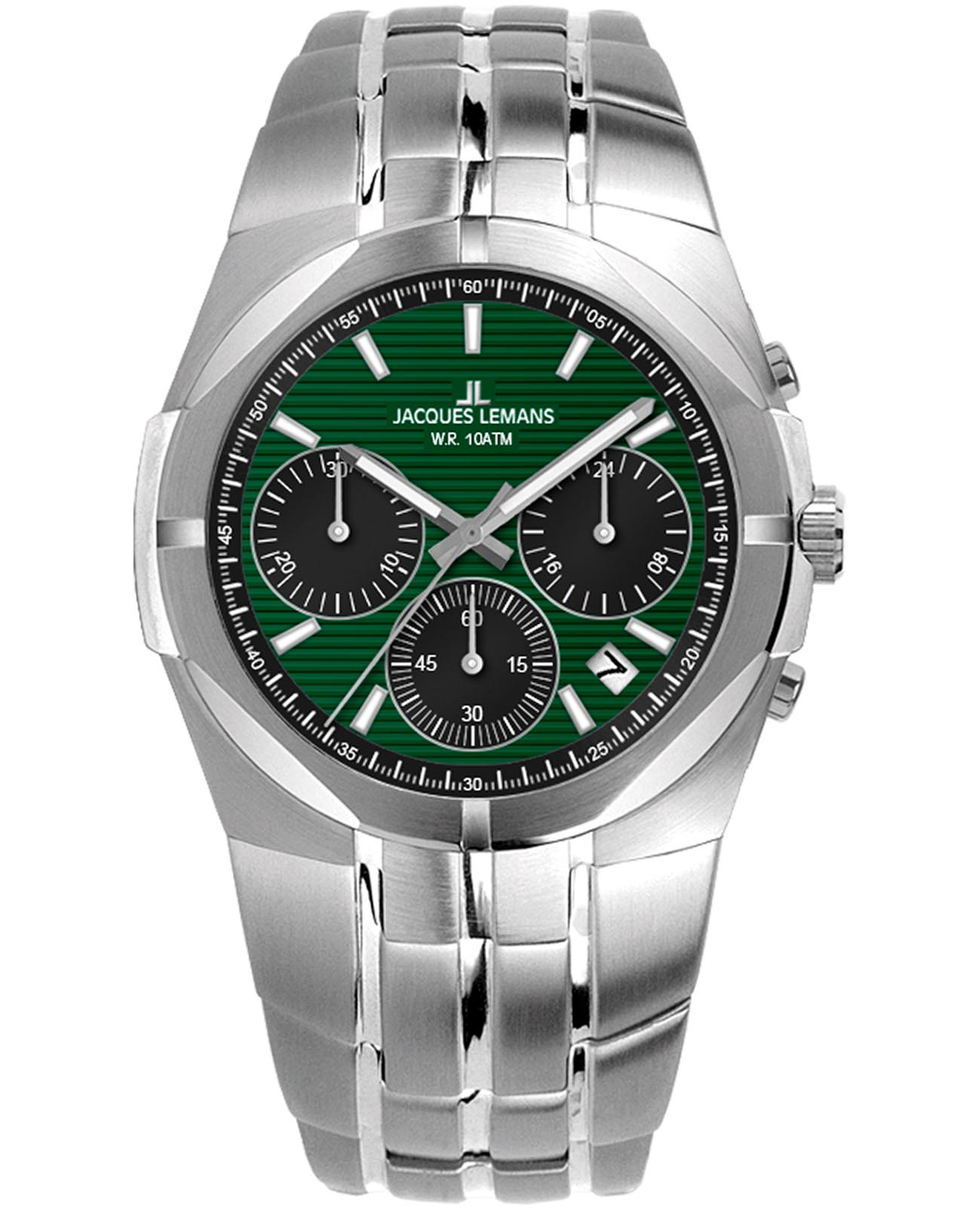 Женские кварцевые часы-хронографХронографФункция позволяет измерять отрезки времени с особой точностью: часы, минуты, секунды. Верным признаком хронографа является наличие на циферблате 3 дополнительных окошек-счётчиков. Jacques Lemans 1-2183D с минеральным стекломМинеральное стеклоМинеральное стекло представляет собой искусственно выращенный минерал кварца. Такое стекло отличается особой устойчивостью к повреждениям и царапинам. Уступает по некоторым качествам сапфировому стеклу.. Корпус выполнен из нержавеющей стали. Стрелки и метки с люминесцентным покрытиемЛюминесцентное покрытиеПозволяет считывать показания времени в темноте. Производители наносят на стрелки, часовые индексы, безель или поверхность циферблата светонакопительный состав, дающий холодное свечение.. Окошко даты находится в положении между 4 и 5 часами. Класс водозащиты: 100 метров, позволит плавать, нырять и заниматься другими водными видами спорта.