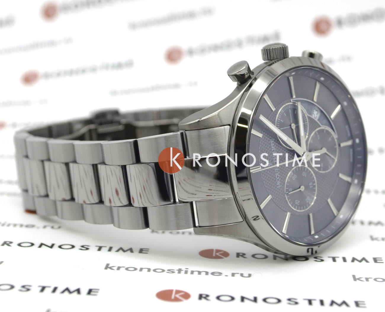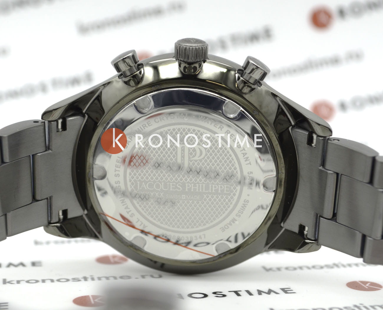 Швейцарские мужские часы-хронографХронографФункция позволяет измерять отрезки времени с особой точностью: часы, минуты, секунды. Верным признаком хронографа является наличие на циферблате 3 дополнительных окошек-счётчиков. с секундомеромСекундомерСекундоме́р — прибор, способный измерять интервалы времени с точностью до долей секунды. Jacques Philippe Gallant JPQGC038347, кварцевый механизм с высокой точностью. Сапфировое стеклоСапфировое стеклоПрочный и надёжный материал из кристалла сапфира синтетического происхождения, характеризующийся особой твёрдостью и устойчивостью к царапинам и повреждениям. устойчивое к появлению царапин, обладающее высокой прозрачностью. Корпус часов изготовлен из нержавеющей стали. На циферблате три дополнительных индикатора. Стрелки с люминесцентным покрытиемЛюминесцентное покрытиеПозволяет считывать показания времени в темноте. Производители наносят на стрелки, часовые индексы, безель или поверхность циферблата светонакопительный состав, дающий холодное свечение.. Окошко даты находится между 4 и 5 часами. Класс водозащиты: 50 метров, позволит защитить корпус от случайных брызг или капель дождя. Стальной браслет на застёжке «бабочка» с кнопкамиЗастёжка "бабочка"Такой вид застёжки дополняется предохранителями, помогающими избежать случайного раскрытия браслета. Обладают изящным исполнением. .