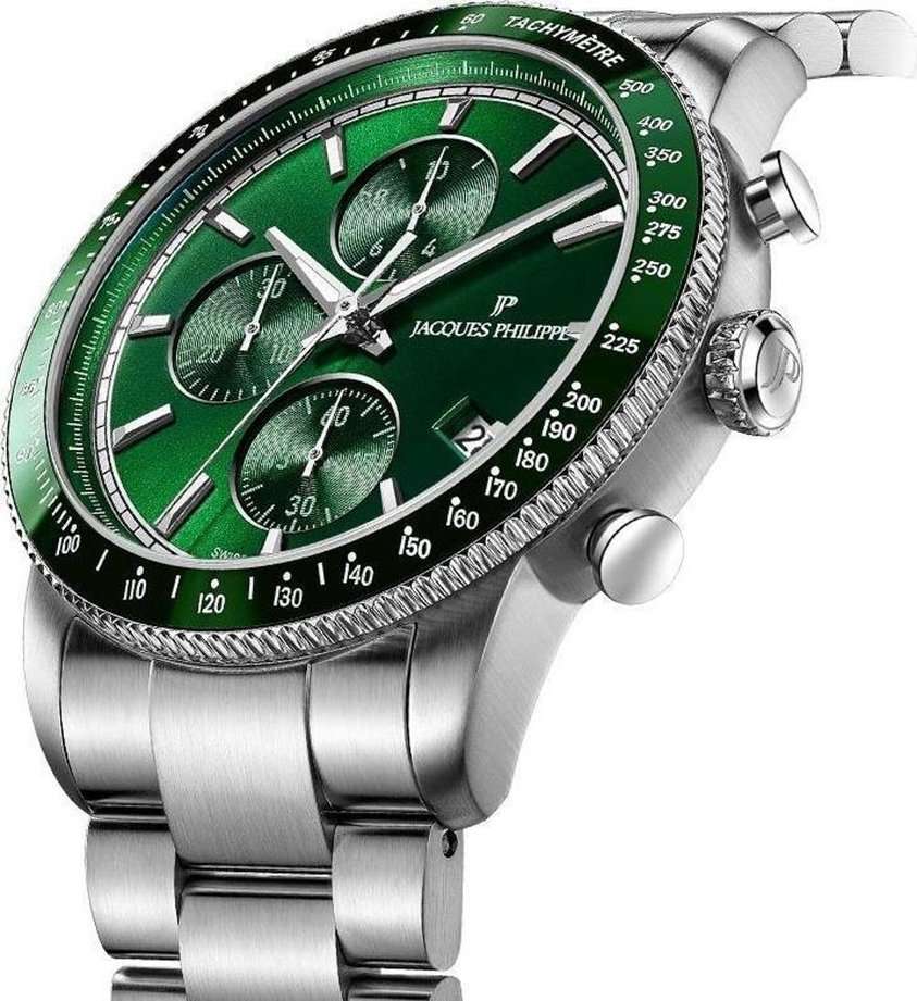 Швейцарские наручные часы Jacques Philippe JPQGC6913X6 сочетают в себе современный дизайн, надежность и функциональность, это стильные швейцарские часы с функцией хронографаХронографФункция позволяет измерять отрезки времени с особой точностью: часы, минуты, секунды. Верным признаком хронографа является наличие на циферблате 3 дополнительных окошек-счётчиков. и секундомераСекундомерСекундоме́р — прибор, способный измерять интервалы времени с точностью до долей секунды.. Корпус круглой формы диаметром 42 мм выполнен из прочной нержавеющей стали, а безельБезельВнешний ободок, закрепляющий стекло. В спортивных часах так называется поворотное кольцо с делениями на циферблате, выполняет роль таймера – замеряет отрезки времени на шкале. Неподвижный безель – элемент декора. Однонаправленно вращающийся безель на дайверских часах позволяет фиксировать моменты погружения и выныривания на поверхность. с элегантным зеленым IP-покрытиемIP-покрытиеМетод ионного напыления. Демонстрирует повышенную устойчивость к истиранию, окислению и химическим веществам. Под воздействием высокого давления и температуры около 1500°C молекулы металла надёжно соединяются с частицами корпуса часов.. Сапфировое стеклоСапфировое стеклоПрочный и надёжный материал из кристалла сапфира синтетического происхождения, характеризующийся особой твёрдостью и устойчивостью к царапинам и повреждениям. с антибликовым покрытиемАнтибликовое покрытиеСлой оксида металла в 0,13-0,3 микрон, благодаря которому стекло часов не бликует и не отражает свет. Антибликовое покрытие уменьшает отражение света в 10 раз, обеспечивая отличную читаемость показателей циферблата. надежно защищает зеленый циферблат от царапин и повреждений. Модель оснащена точным кварцевым механизмом, а также дополнительными функциями — тахиметромТахиметрРазмеченная шкала, располагается на ободке или безеле часов. Тахиметр позволяет рассчитать скорость на определённом участке пути, расстояние измеряется в километрах или милях. и индикатором даты, что делает часы не только стильным аксессуаром, но и практичным помощником на каждый день. Серебряный браслет шириной 22 мм удобно фиксируется на запястье с помощью застежки «бабочка»Застёжка "бабочка"Такой вид застёжки дополняется предохранителями, помогающими избежать случайного раскрытия браслета. Обладают изящным исполнением. . Стрелки имеют люминесцентное покрытиеЛюминесцентное покрытиеПозволяет считывать показания времени в темноте. Производители наносят на стрелки, часовые индексы, безель или поверхность циферблата светонакопительный состав, дающий холодное свечение. для удобства чтения времени в темноте. Водозащита 5 АТМ позволяет не снимать часы при дожде и случайных контактах с водой.