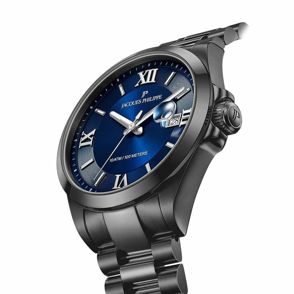 Швейцарские мужские наручные часы Jacques Philippe Infinitum JPQGS338337V2. Надежный кварцевый механизм гарантирует высокую точность отображения времени, позволяя вам всегда быть пунктуальным. Сапфировое стеклоСапфировое стеклоПрочный и надёжный материал из кристалла сапфира синтетического происхождения, характеризующийся особой твёрдостью и устойчивостью к царапинам и повреждениям. с антибликовым покрытиемАнтибликовое покрытиеСлой оксида металла в 0,13-0,3 микрон, благодаря которому стекло часов не бликует и не отражает свет. Антибликовое покрытие уменьшает отражение света в 10 раз, обеспечивая отличную читаемость показателей циферблата. устойчивое к появлению царапин, обладающее высокой прозрачностью и обеспечивает отличную читаемость информации при любом освещении. Корпус из нержавеющей стали 316L с IP-покрытиемIP-покрытиеМетод ионного напыления. Демонстрирует повышенную устойчивость к истиранию, окислению и химическим веществам. Под воздействием высокого давления и температуры около 1500°C молекулы металла надёжно соединяются с частицами корпуса часов. черного цвета, диаметром 40 мм обеспечивает долговечность и устойчивость к внешним воздействиям. Стрелки и метки с люминесцентным покрытиемЛюминесцентное покрытиеПозволяет считывать показания времени в темноте. Производители наносят на стрелки, часовые индексы, безель или поверхность циферблата светонакопительный состав, дающий холодное свечение.. Окошко даты находится в положении 3 часа. Класс водозащиты: 100 метров позволит плавать, нырять и заниматься другими водными видами спорта. Стальной браслет с IP-покрытиемIP-покрытиеМетод ионного напыления. Демонстрирует повышенную устойчивость к истиранию, окислению и химическим веществам. Под воздействием высокого давления и температуры около 1500°C молекулы металла надёжно соединяются с частицами корпуса часов. на застёжке «бабочка» с кнопкамиЗастёжка "бабочка"Такой вид застёжки дополняется предохранителями, помогающими избежать случайного раскрытия браслета. Обладают изящным исполнением. обеспечивает комфортное ношение. Часы подходят для повседневного ношения, деловых встреч и особых случаев, добавляя вашему образу завершенности и элегантности.