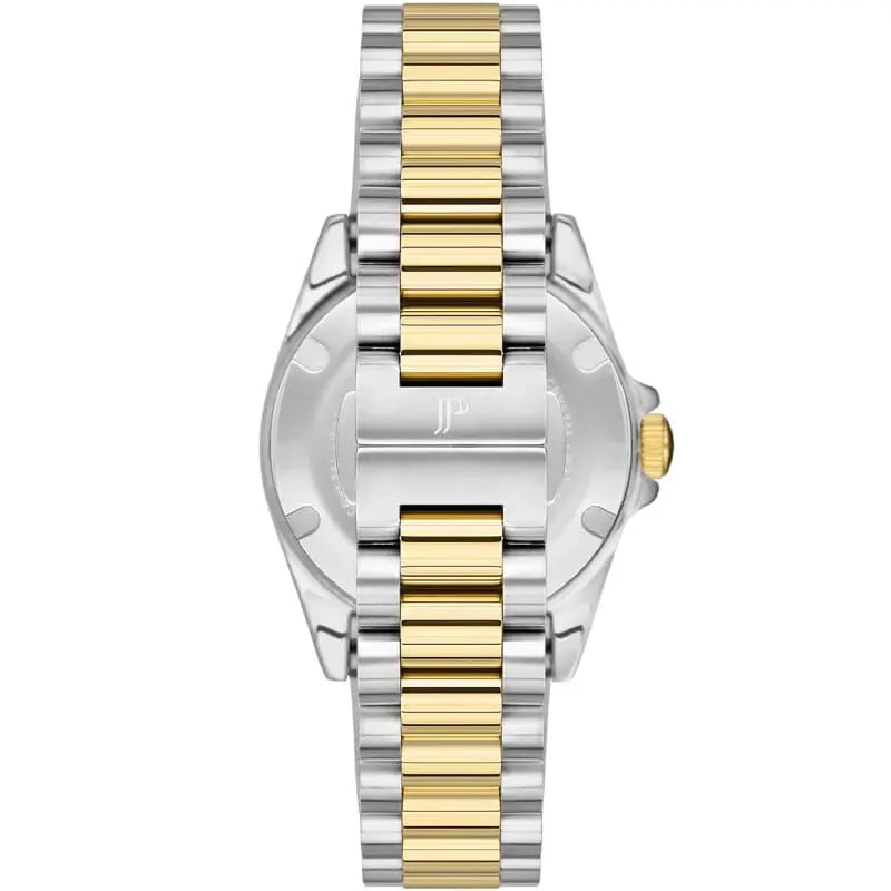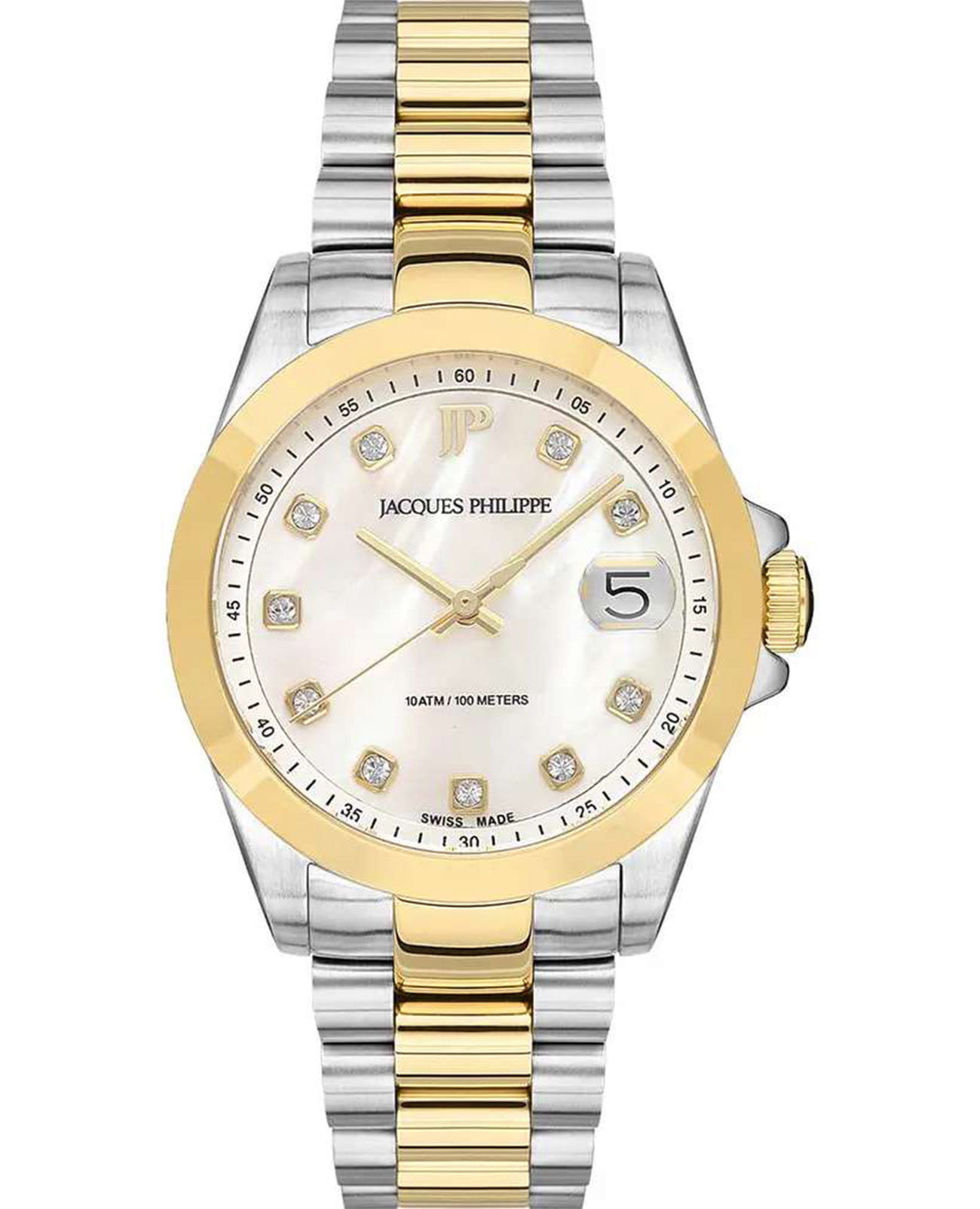Женские кварцевые часы Jacques Philippe из коллекции Infinitum — это элегантный и надёжный аксессуар. Корпус диаметром 34 мм выполнен из нержавеющей стали 316L. БезельБезельВнешний ободок, закрепляющий стекло. В спортивных часах так называется поворотное кольцо с делениями на циферблате, выполняет роль таймера – замеряет отрезки времени на шкале. Неподвижный безель – элемент декора. Однонаправленно вращающийся безель на дайверских часах позволяет фиксировать моменты погружения и выныривания на поверхность. с IP-покрытиемIP-покрытиеМетод ионного напыления. Демонстрирует повышенную устойчивость к истиранию, окислению и химическим веществам. Под воздействием высокого давления и температуры около 1500°C молекулы металла надёжно соединяются с частицами корпуса часов. цвета жёлтого золота. Циферблат перламутрового белого цвета оформлен точками и стрелками. Окошко даты расположено в положении 3 часов. Циферблат украшен кристаллами и защищён сапфировым стекломСапфировое стеклоПрочный и надёжный материал из кристалла сапфира синтетического происхождения, характеризующийся особой твёрдостью и устойчивостью к царапинам и повреждениям.. Механизм — швейцарское кварцевое движение калибра Ronda 505 (Swiss Made). Часы оснащены стальным браслетом с IP-покрытиемIP-покрытиеМетод ионного напыления. Демонстрирует повышенную устойчивость к истиранию, окислению и химическим веществам. Под воздействием высокого давления и температуры около 1500°C молекулы металла надёжно соединяются с частицами корпуса часов. на застёжке «бабочка» с кнопкамиЗастёжка "бабочка"Такой вид застёжки дополняется предохранителями, помогающими избежать случайного раскрытия браслета. Обладают изящным исполнением. . Водонепроницаемость 100 м позволяет использовать часы для плавания и повседневного ношения. Идеальный выбор для тех, кто ценит швейцарское качество и безупречный стиль.