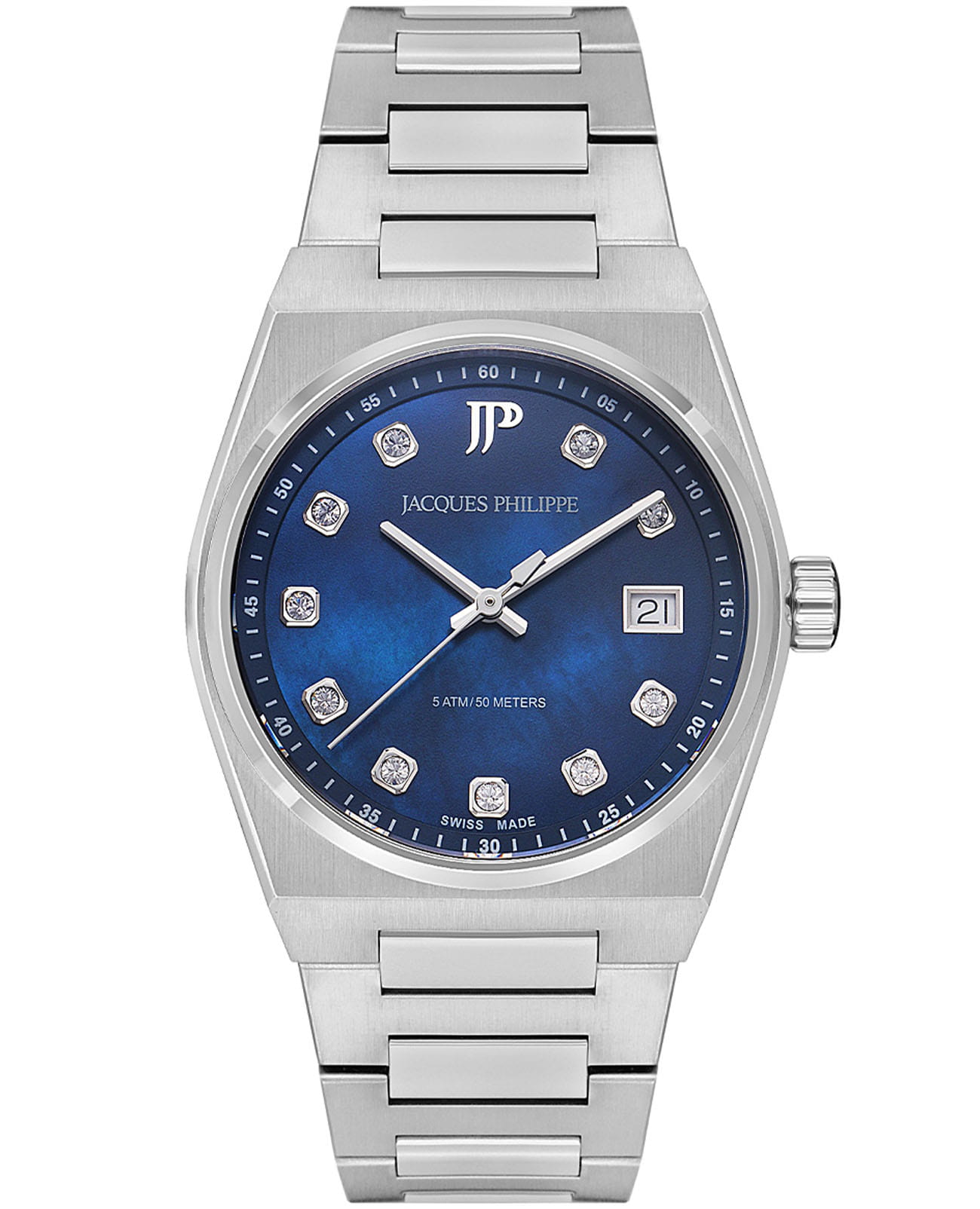 Часы Jacques Philippe JPQLS521396S из коллекции Aurora — элегантные мужские часы, сочетающие швейцарское качество и современный дизайн. Корпус диаметром 34 мм выполнен из нержавеющей стали, а синий циферблат защищён сапфировым стекломСапфировое стеклоПрочный и надёжный материал из кристалла сапфира синтетического происхождения, характеризующийся особой твёрдостью и устойчивостью к царапинам и повреждениям.. Циферблат инкрустирован кристаллами.