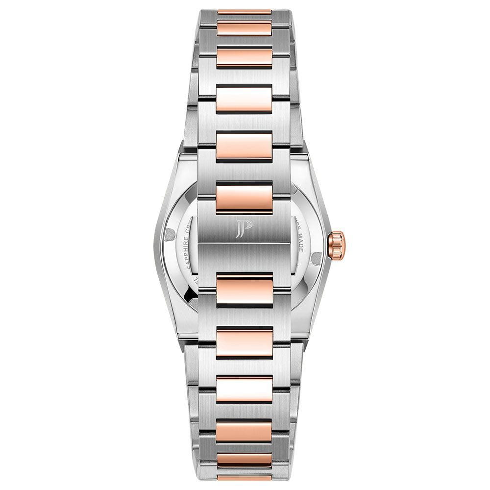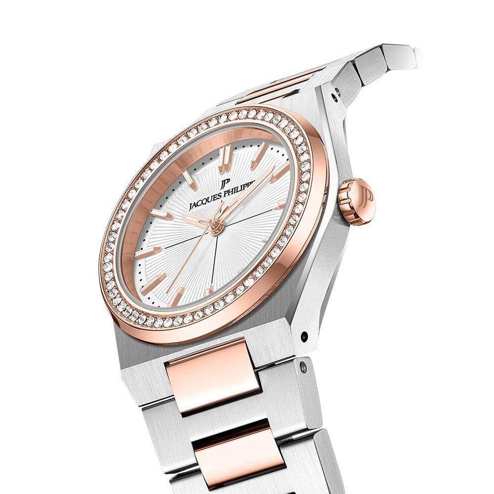 Часы Jacques Philippe JPQLS867328 из коллекции Adastra — элегантные женские часы, сочетающие швейцарское качество и современный дизайн. Корпус диаметром 30 мм выполнен из нержавеющей стали, а циферблат защищён сапфировым стекломСапфировое стеклоПрочный и надёжный материал из кристалла сапфира синтетического происхождения, характеризующийся особой твёрдостью и устойчивостью к царапинам и повреждениям.. БезельБезельВнешний ободок, закрепляющий стекло. В спортивных часах так называется поворотное кольцо с делениями на циферблате, выполняет роль таймера – замеряет отрезки времени на шкале. Неподвижный безель – элемент декора. Однонаправленно вращающийся безель на дайверских часах позволяет фиксировать моменты погружения и выныривания на поверхность. с PVD-покрытиемPVDУльтратонкое покрытие наносится в технике вакуумного напыления, сочетает в себе нитрид титана особой прочности со слоем золота или оксида хрома. Несёт в себе декоративную или защитную функцию. инкрустирован кристаллами.