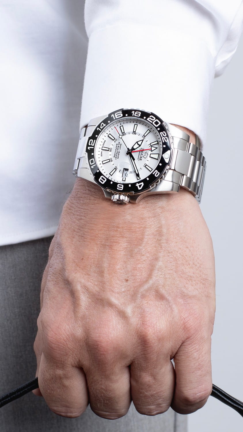 Мужские швейцарские часы Jaguar Ceramic GMT J1011/1. Кварцевый швейцарский калибр Ronda 515.24H. Сапфировое стеклоСапфировое стеклоПрочный и надёжный материал из кристалла сапфира синтетического происхождения, характеризующийся особой твёрдостью и устойчивостью к царапинам и повреждениям. устойчивое к мелким механическим повреждениям. Корпус и браслет часов изготовлены из нержавеющей стали. Стрелки и метки с люминесцентным покрытиемЛюминесцентное покрытиеПозволяет считывать показания времени в темноте. Производители наносят на стрелки, часовые индексы, безель или поверхность циферблата светонакопительный состав, дающий холодное свечение.. Окошко даты находится в положении 3 часа. Класс водозащиты: 200 метров, позволит плавать, нырять и заниматься другими водными видами спорта. Стальной браслет на раскладной застёжкеРаскладная застёжкаТакой тип застёжки используется только на браслетах из металла. Она никогда не раскрывается полностью, происходит разделение на 2 и более частей. Раскладывающая застёжка снизит вероятность потери часов к минимуму.. Дополнительная центральная стрелка для второго часового пояса. Вращающийся безельБезельВнешний ободок, закрепляющий стекло. В спортивных часах так называется поворотное кольцо с делениями на циферблате, выполняет роль таймера – замеряет отрезки времени на шкале. Неподвижный безель – элемент декора. Однонаправленно вращающийся безель на дайверских часах позволяет фиксировать моменты погружения и выныривания на поверхность. с боковым рифлением из нержавеющей стали и керамики.
