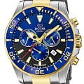 Мужские швейцарские часы-хронографХронографФункция позволяет измерять отрезки времени с особой точностью: часы, минуты, секунды. Верным признаком хронографа является наличие на циферблате 3 дополнительных окошек-счётчиков. Jaguar Executive Diver Chrono J862/4. Кварцевый швейцарский калибр Ronda 6003D. Сапфировое стеклоСапфировое стеклоПрочный и надёжный материал из кристалла сапфира синтетического происхождения, характеризующийся особой твёрдостью и устойчивостью к царапинам и повреждениям. устойчивое к мелким механическим повреждениям. Корпус часов изготовлен из нержавеющей стали. Стрелки и метки с люминесцентным покрытиемЛюминесцентное покрытиеПозволяет считывать показания времени в темноте. Производители наносят на стрелки, часовые индексы, безель или поверхность циферблата светонакопительный состав, дающий холодное свечение.. Окошко даты находится в положении между «4» и «5 часами». Класс водозащиты: 200 метров, позволит плавать, нырять и заниматься другими водными видами спорта. Стальной браслет с частичным PVD-покрытиемPVDУльтратонкое покрытие наносится в технике вакуумного напыления, сочетает в себе нитрид титана особой прочности со слоем золота или оксида хрома. Несёт в себе декоративную или защитную функцию. на раскладной застёжкеРаскладная застёжкаТакой тип застёжки используется только на браслетах из металла. Она никогда не раскрывается полностью, происходит разделение на 2 и более частей. Раскладывающая застёжка снизит вероятность потери часов к минимуму.. БезельБезельВнешний ободок, закрепляющий стекло. В спортивных часах так называется поворотное кольцо с делениями на циферблате, выполняет роль таймера – замеряет отрезки времени на шкале. Неподвижный безель – элемент декора. Однонаправленно вращающийся безель на дайверских часах позволяет фиксировать моменты погружения и выныривания на поверхность. с PVD-покрытиемPVDУльтратонкое покрытие наносится в технике вакуумного напыления, сочетает в себе нитрид титана особой прочности со слоем золота или оксида хрома. Несёт в себе декоративную или защитную функцию..
